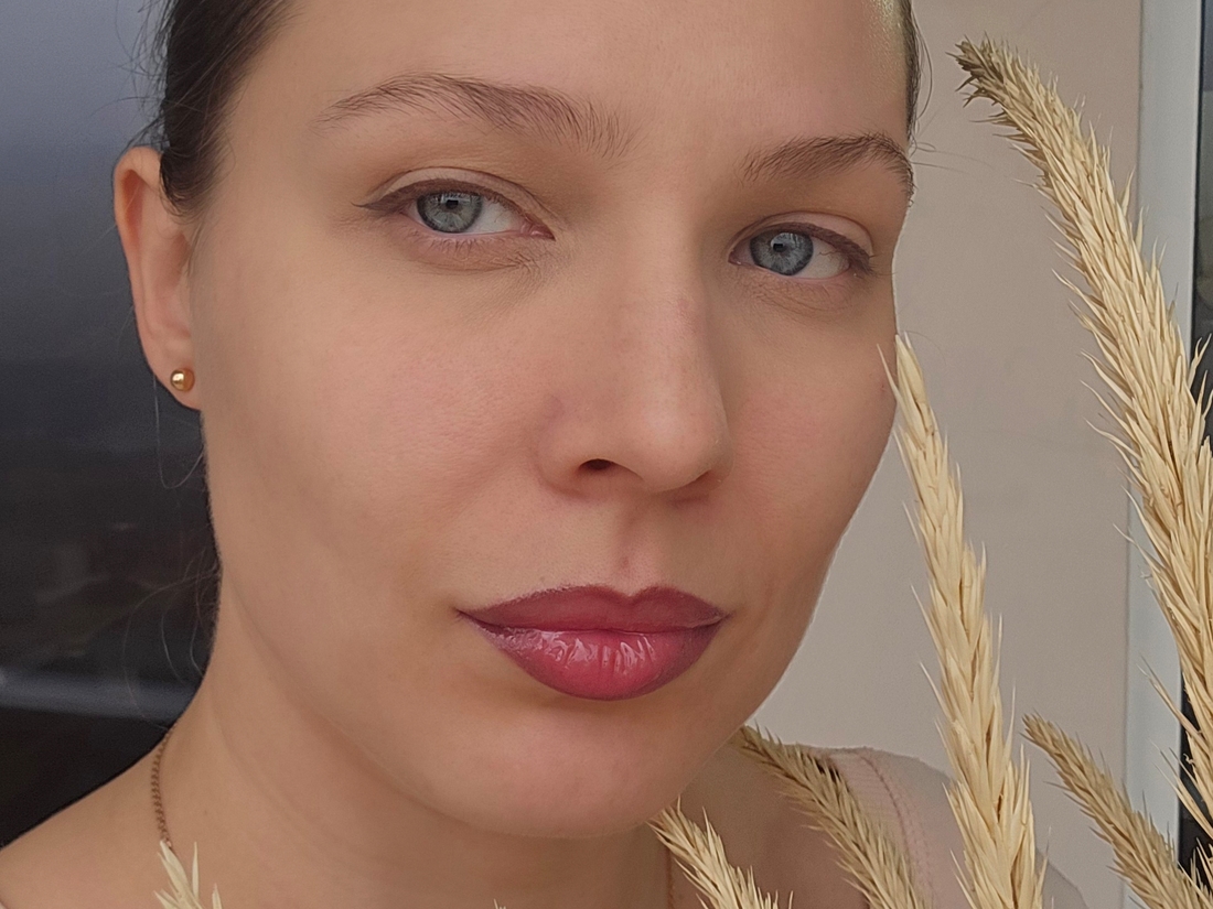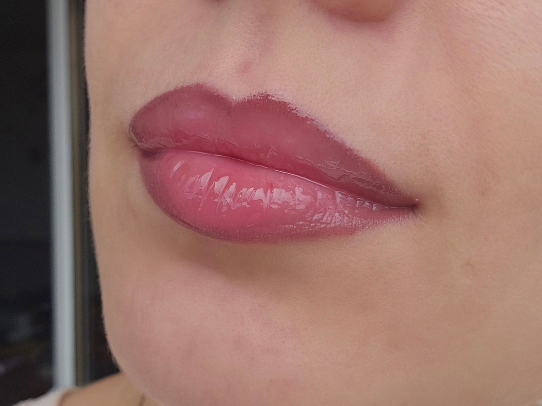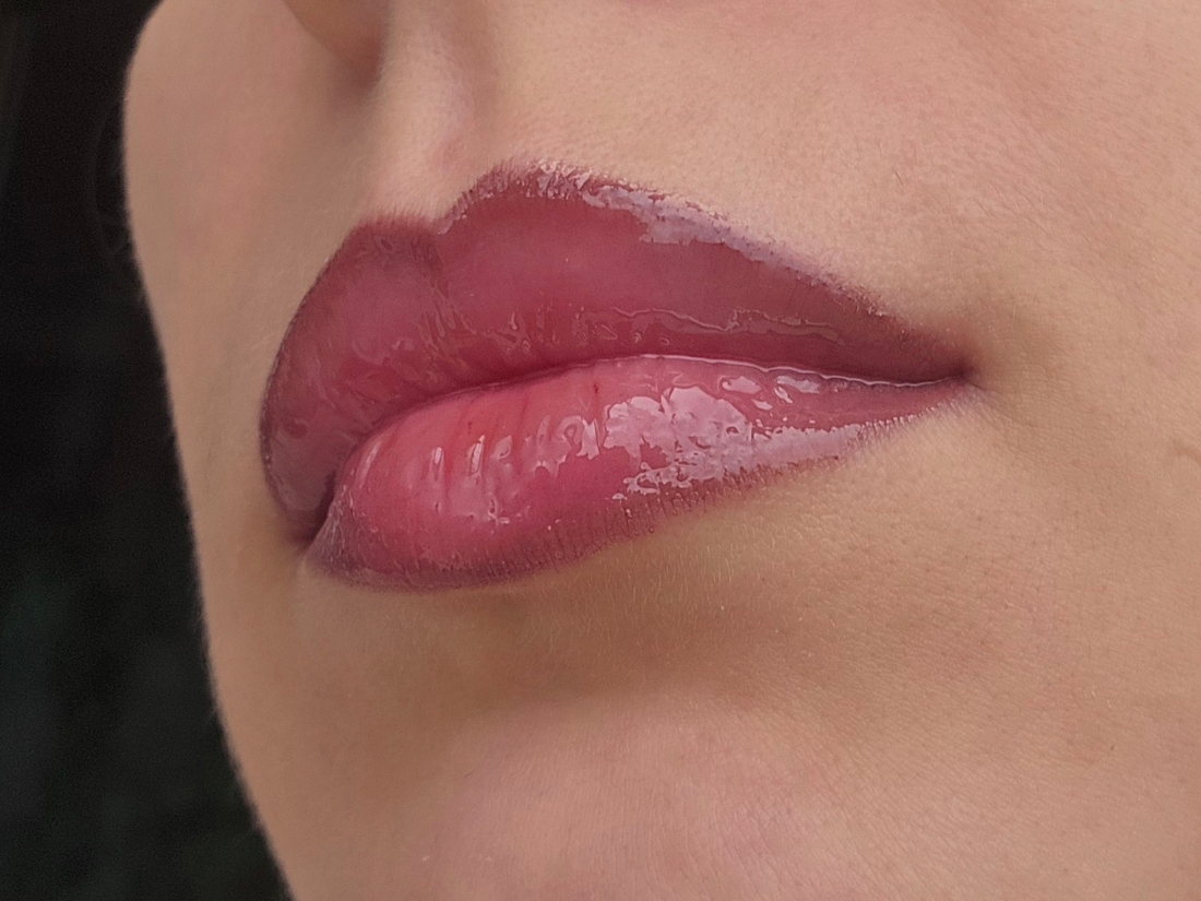 Блеск красиво блестит, создавая акцент на губах и придавая им сочный ягодный оттенок. Отлично увлажняет и комфортный в течение дня, не стекает с губ.