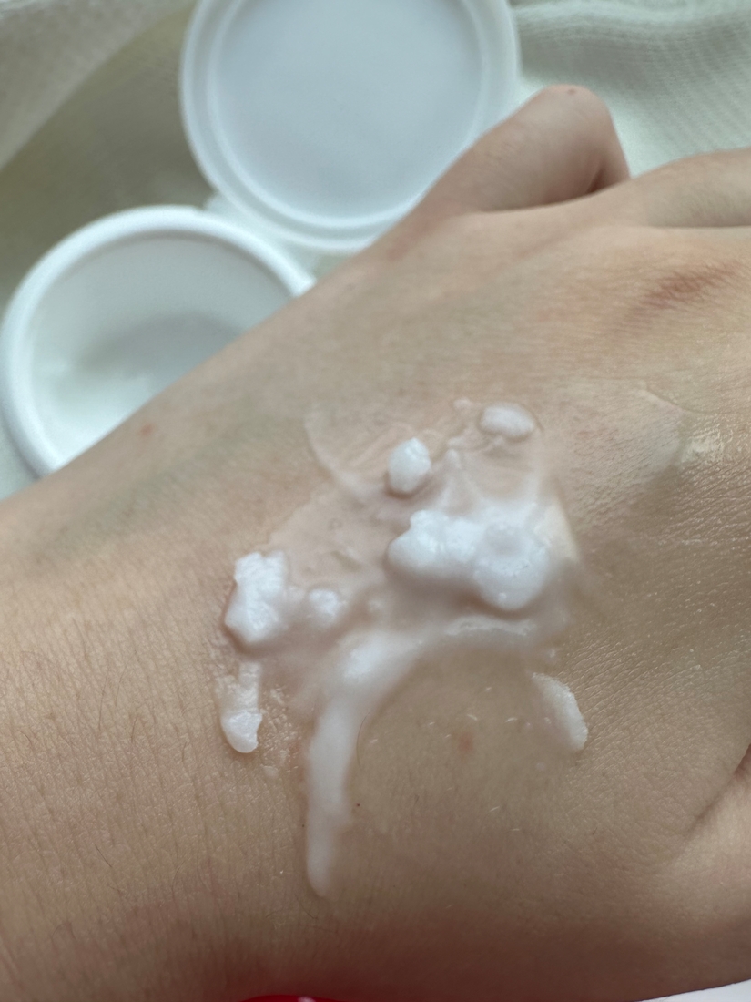 Затем добавляю немного воды и получаю эмульгацию: текстура становится молочной и легко смывается водой. Как можно заметить, от косметики на руке и следа не осталось.