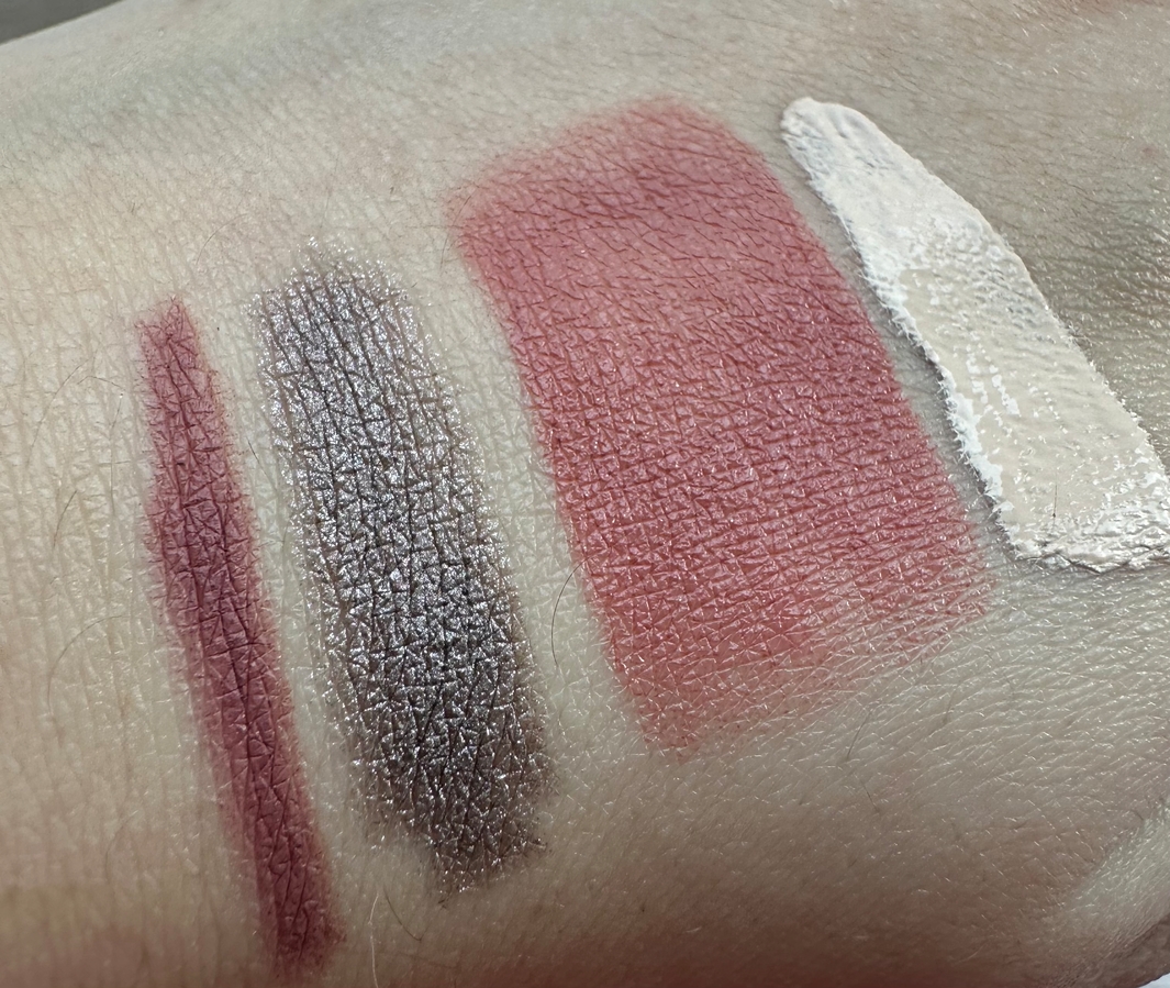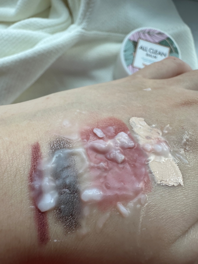 На фото в качестве примера на руку нанесены гелевый карандаш, кремовые тени и румяна, консилер. Проверим бальзам в деле.