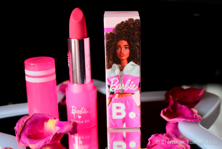 Цвет помады отличается от того, что представлен на промо-фото. В реальности он тёмно-розовый, а не лилово-коричневый. Я не могу назвать его очень ярким, но на губах он выглядит очень ярко и совсем не так, как на фото из интернета. Флакон сделан из пластика, корпус металлический. На нём указано, что оттенок лимитированный, а на пластике есть название коллекции и коллабрации с брендом Барби.