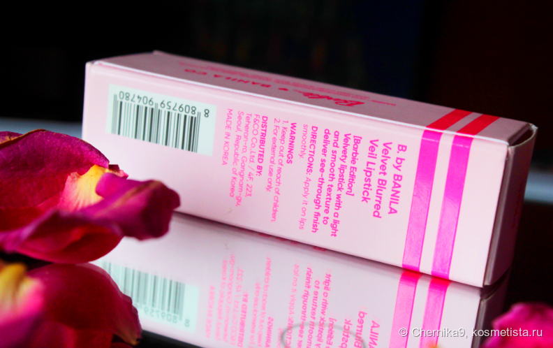 На коробочке указано название помады и место производства (Корея). При этом надписи и полоски ярко-кислотно-розового цвета, хотя фотоаппарат немного изменил их оттенок.