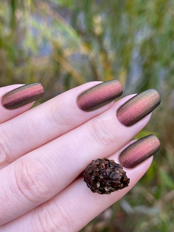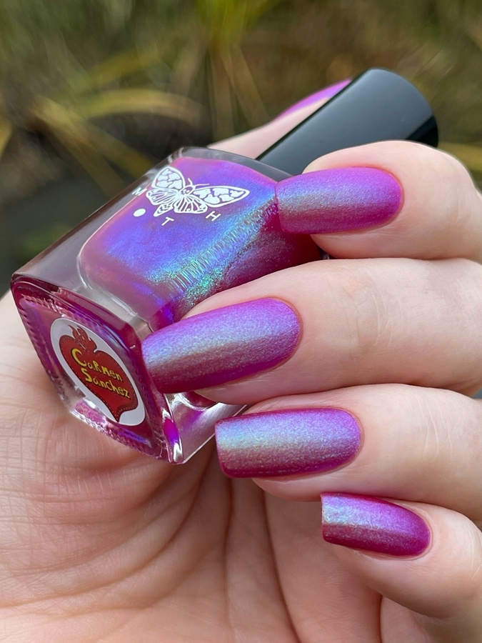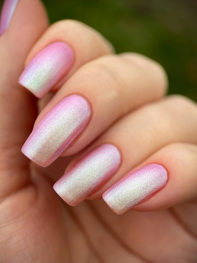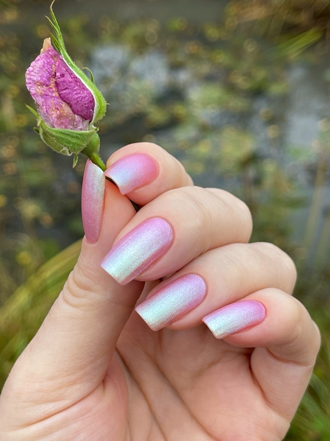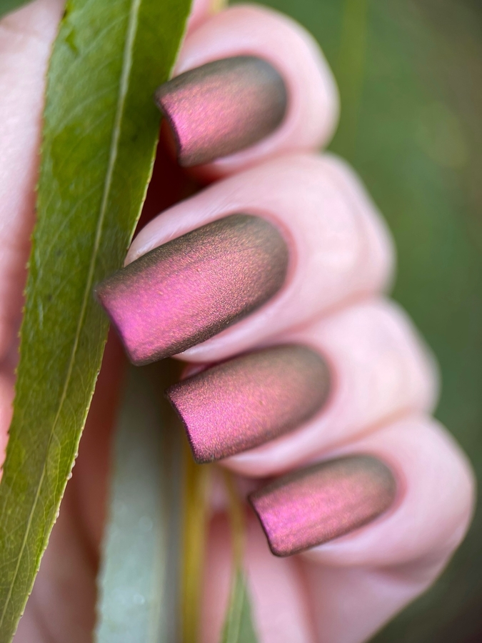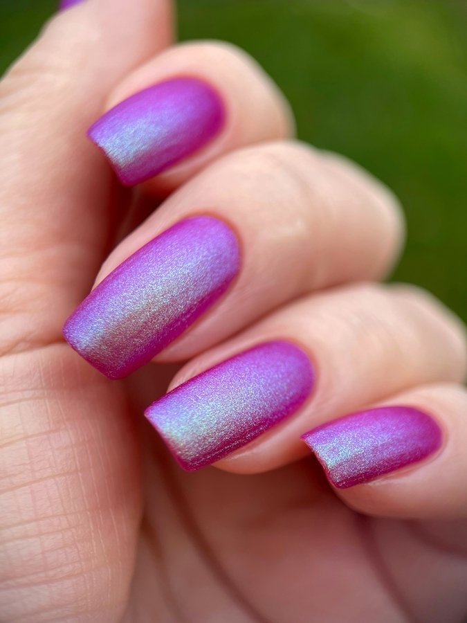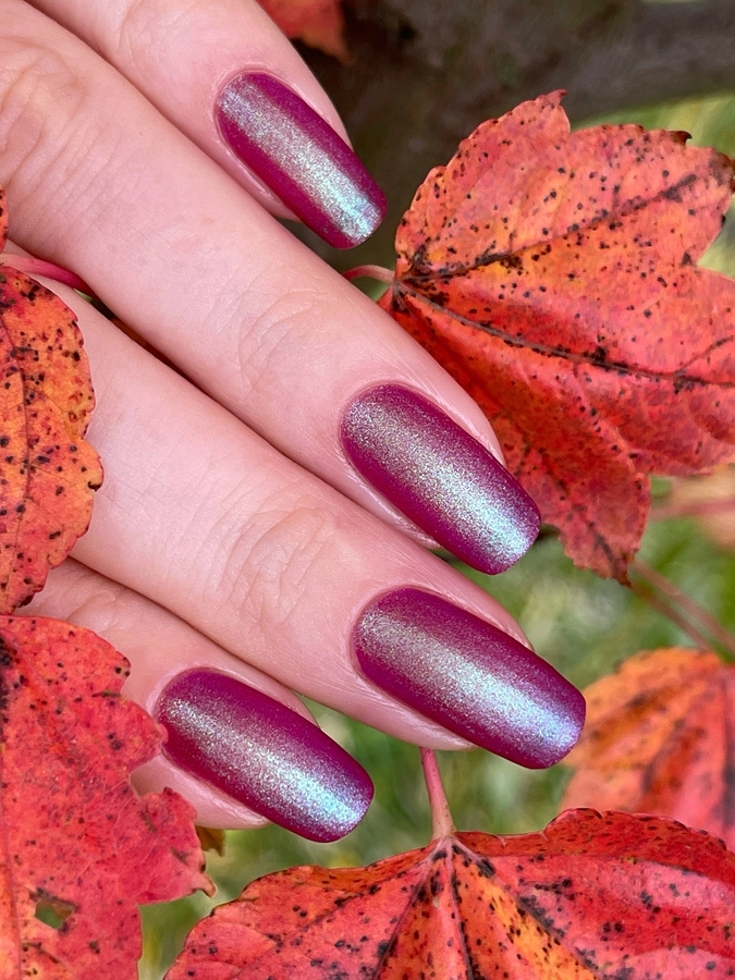 Черная база и много фуксийно-розово-зеленого шиммера.