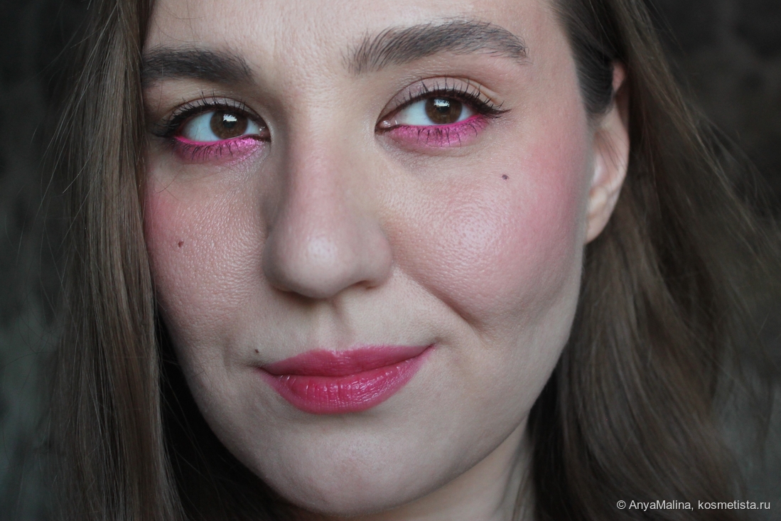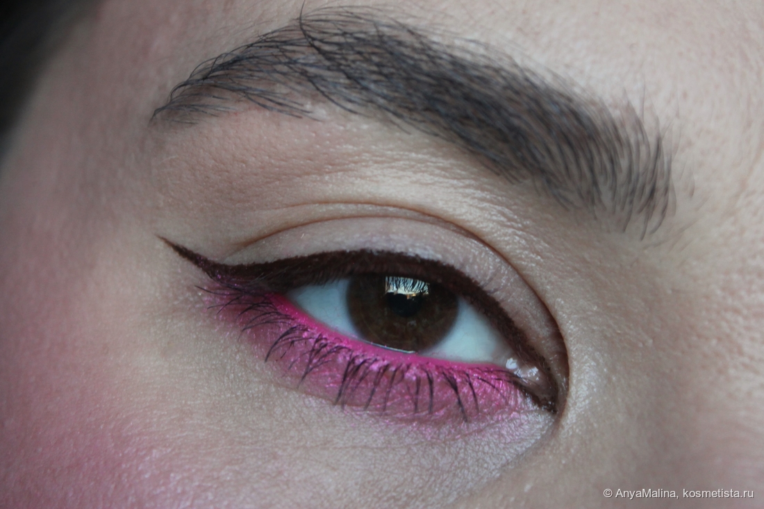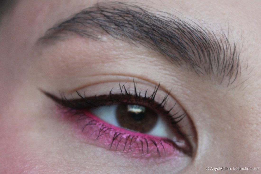Логика в макияже глаз примитивная: прокрашенная межресничка, тем же коричневым лайнером средняя стрелочка, розовый карандаш на нижней слизистой, поти туда же, а именно на нижнее веко, розовые тени, тушь на верхние и нижние ресницы.