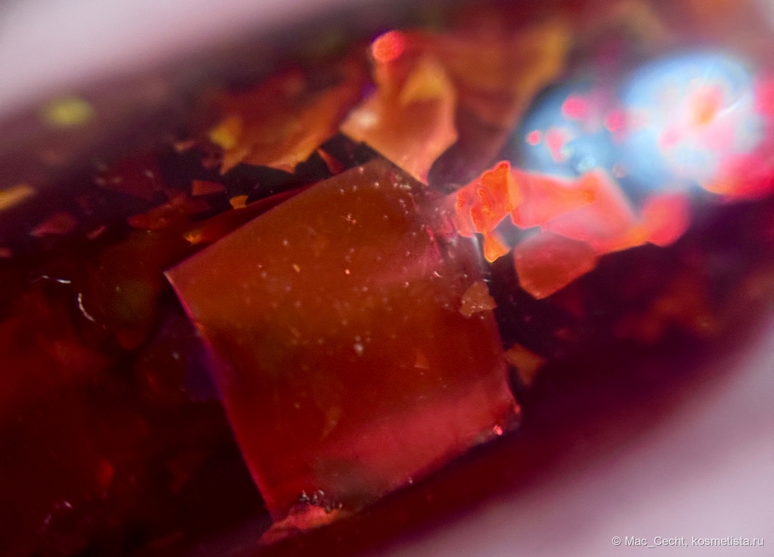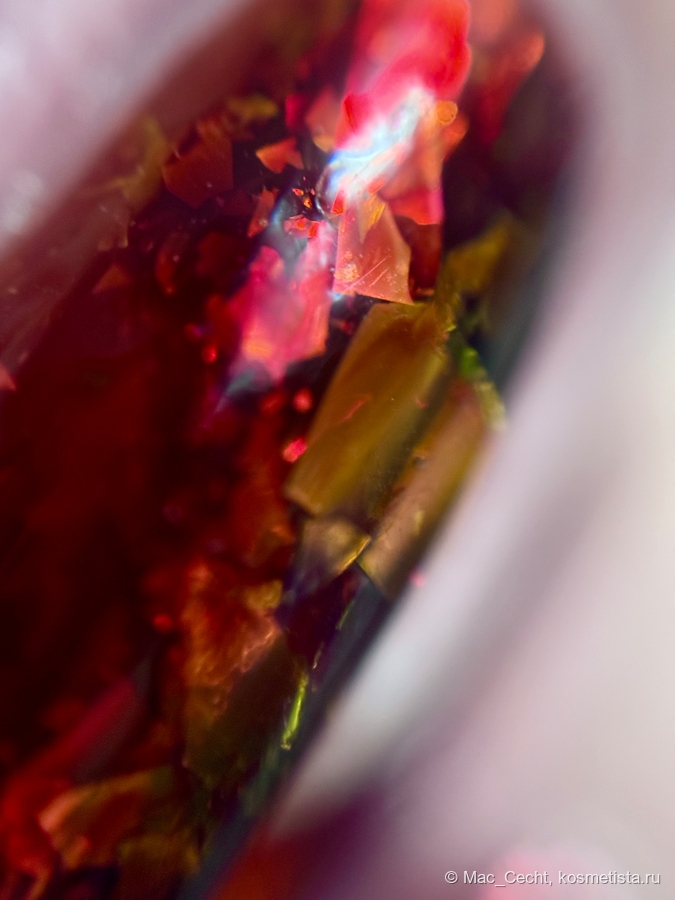 Вот здесь по слюде во флаконе видно, что от угла педния света слюда может казаться рыже-огненно-золотой, а база становится более теплой.