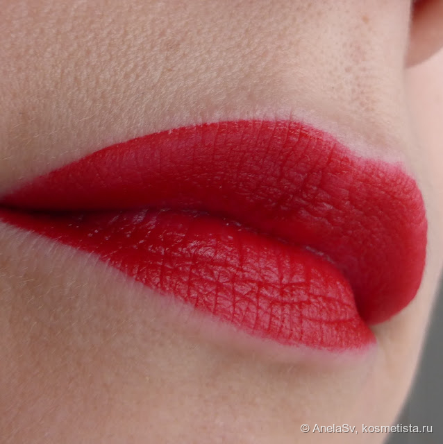 Несмотря на насыщенность тона, помада ведет себя неожиданно спокойно: не растекается, не подчеркивает неровности и не создает эффект «улыбки Джокера». Однако важно понимать, что это не суперстойкая матовая формула — отпечатки она оставляет легко.