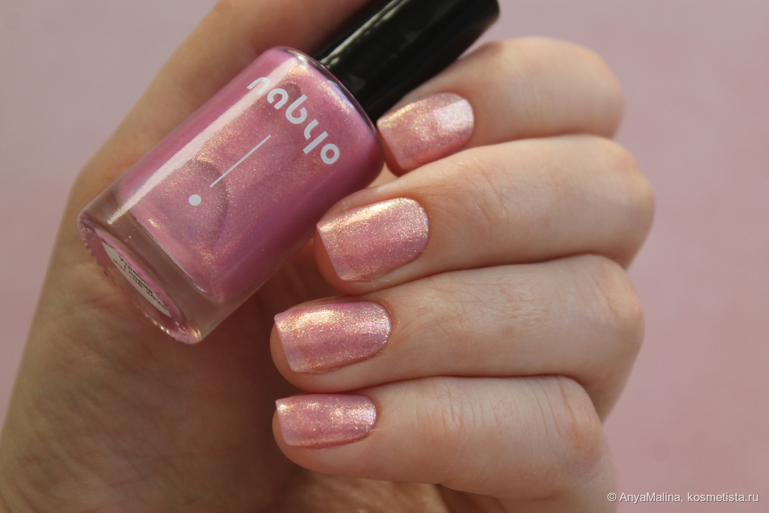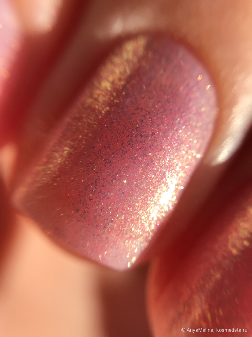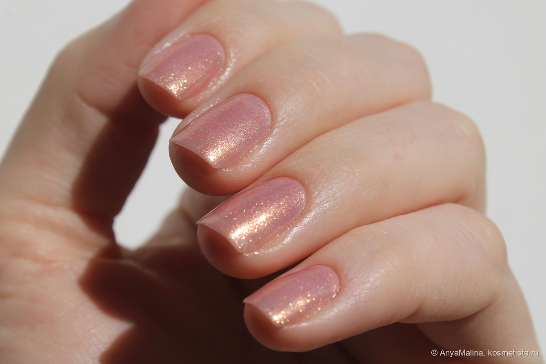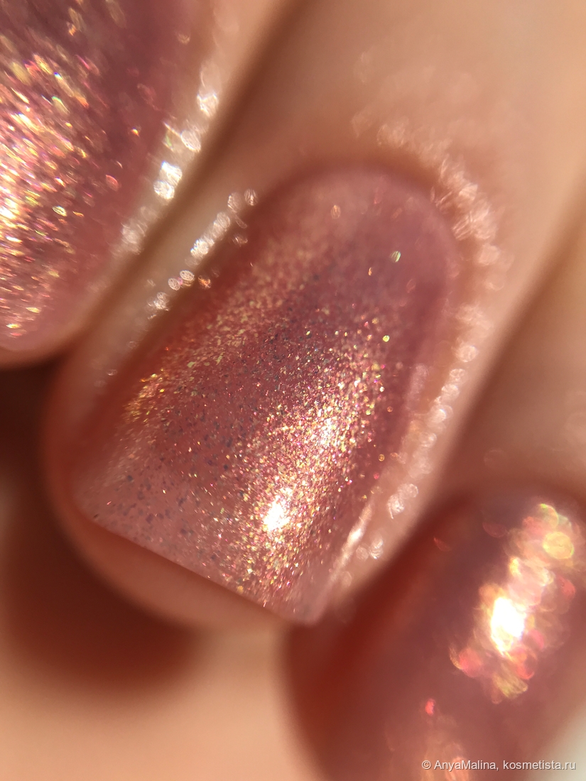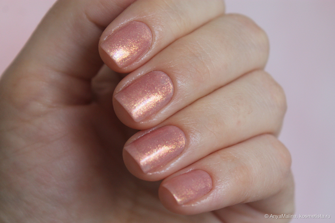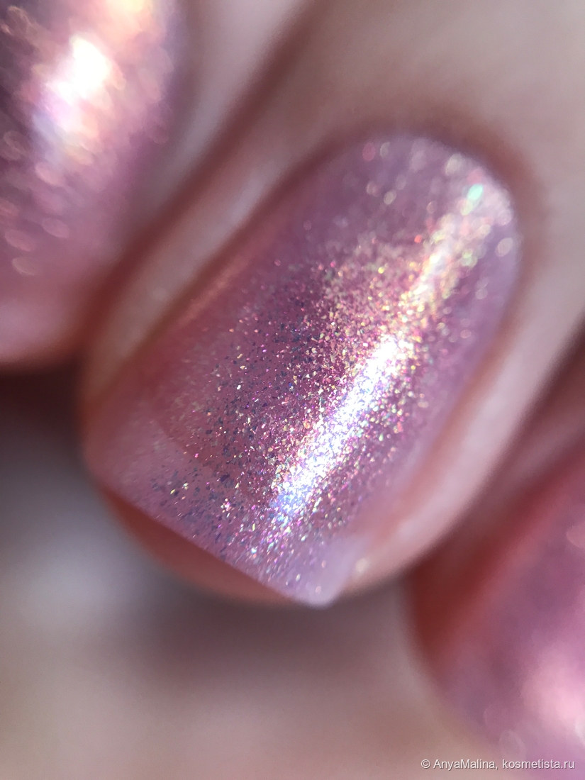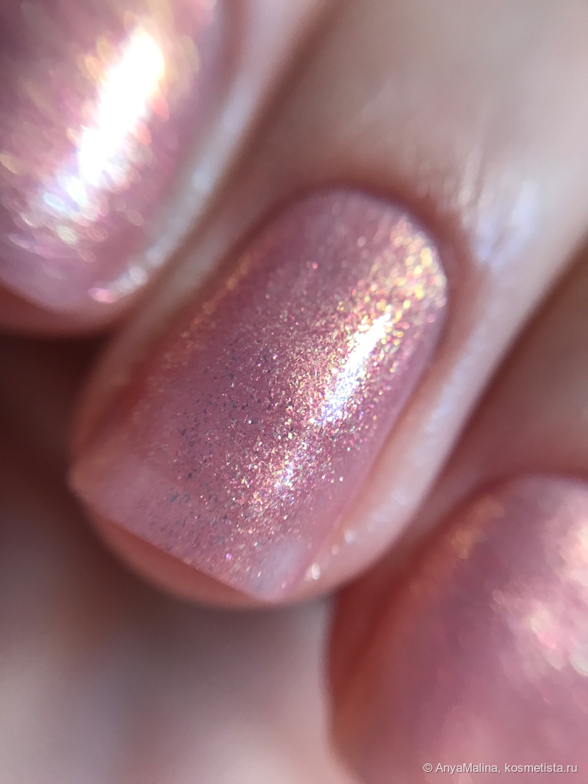 «Нежно-розовый полупрозрачный лак с крупным красно-золотистым шиммером аврора».