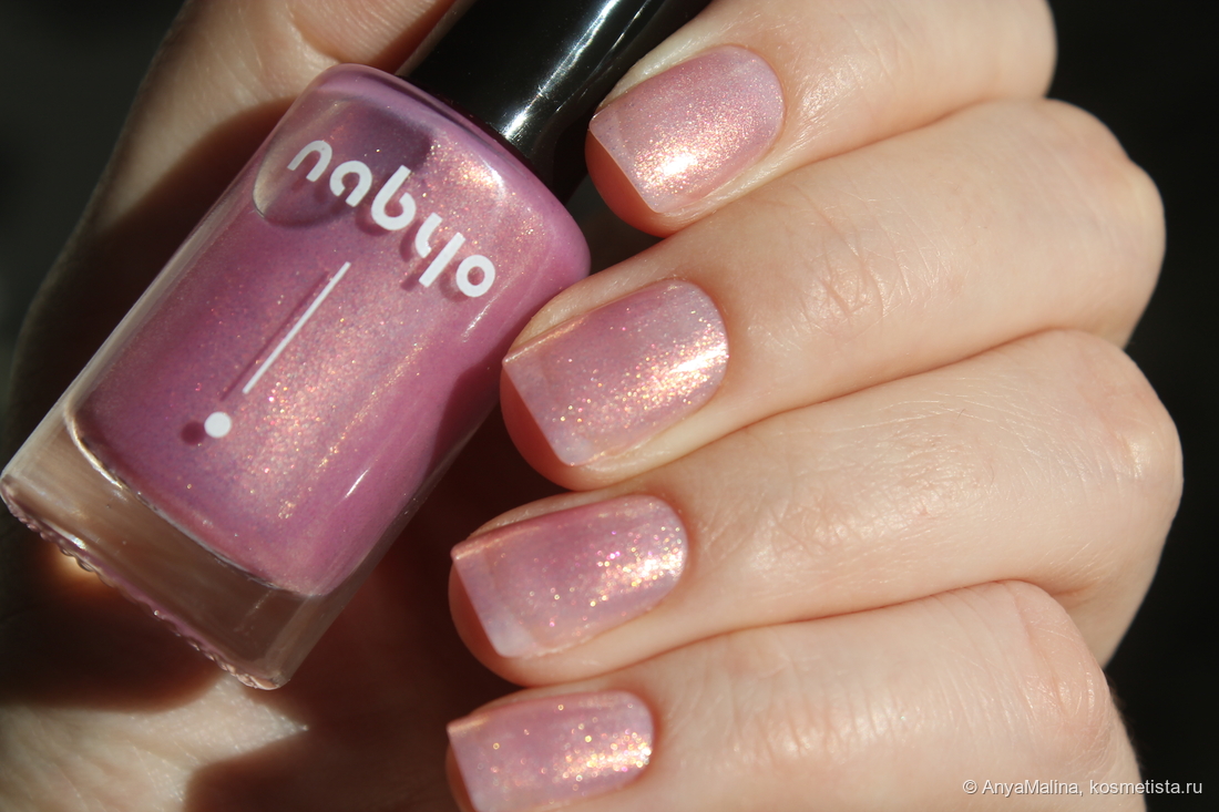 Так, наверное, можно было показать румяна Nars Orgasm, если бы они реинкарнировались в лак для ногтей. Холодная стеклянная розовая база и золотой среднего помола шиммер.