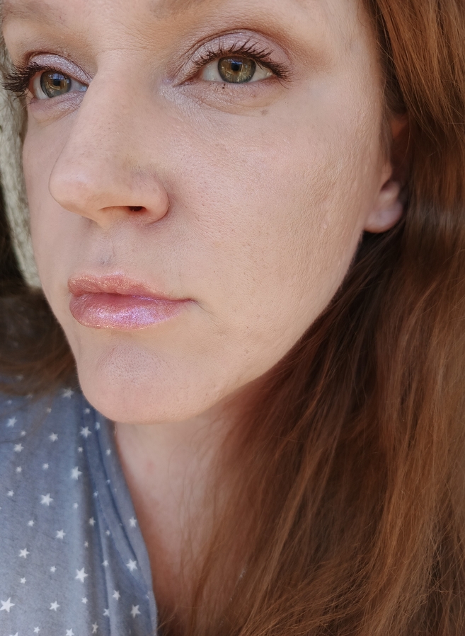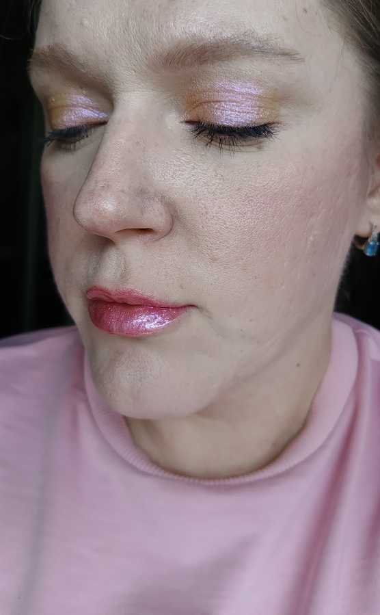 Также не могу сказать, что мне нравится этот металлизированный эффект. Этих блесток так много, что они дают эффект металлика, что вообще не уместно на ежедневную носку. То есть на какое-то тематическое фото, фотосессии или образа для соцсети — красота. Но вот обычный день и обычный макияж этот блеск не украшает. Носить мне его совершенно не хочется.