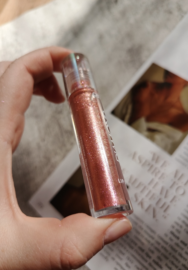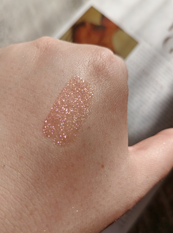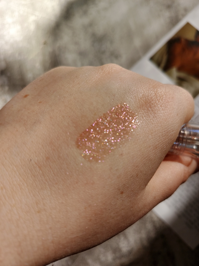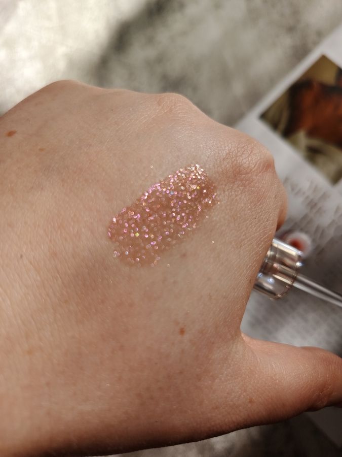 Цветовой базы блеск не имеет, но в прозрачной массе очень много разноцветных розово-рыже-золотистых блесток с небольшим вкраплением голубого и серебра.