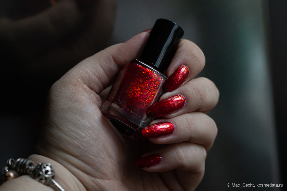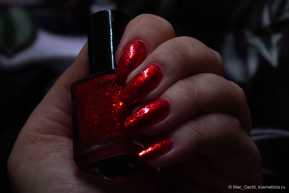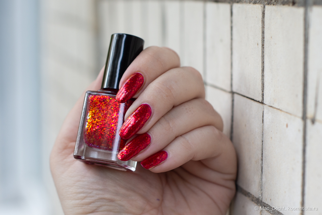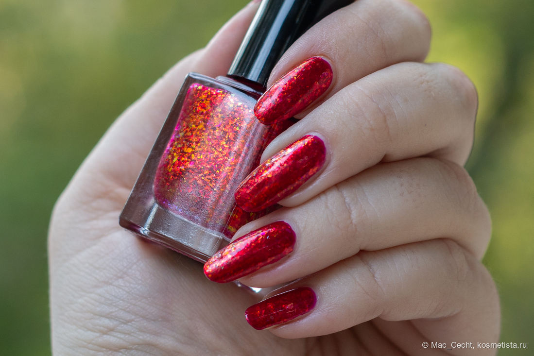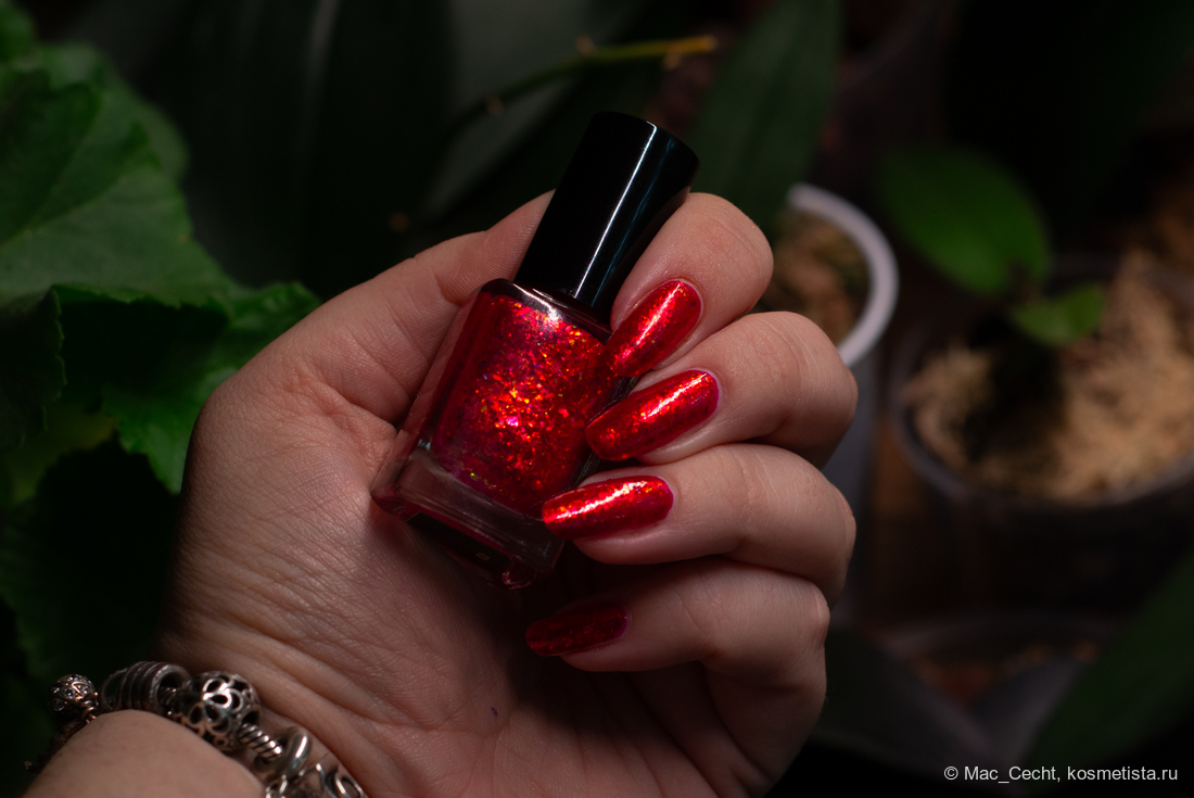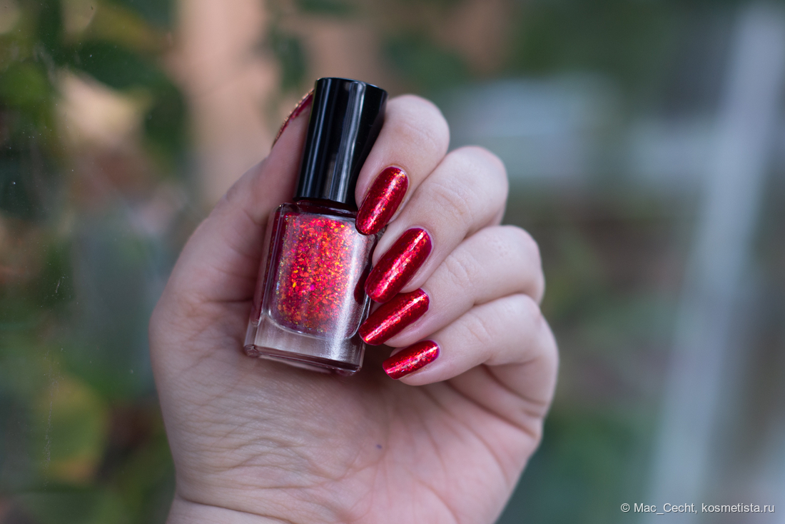 Chili Powder — это холодный красный лак с красной переливающейся слюдой. Лак действительно очень холодный, теплить точно не будет, он прямо с малиновой ноткой. Слюда в нем красная, металлизированная, мягкая. Довольно мелкая по моим меркам, а для Masura, например, стандартная.