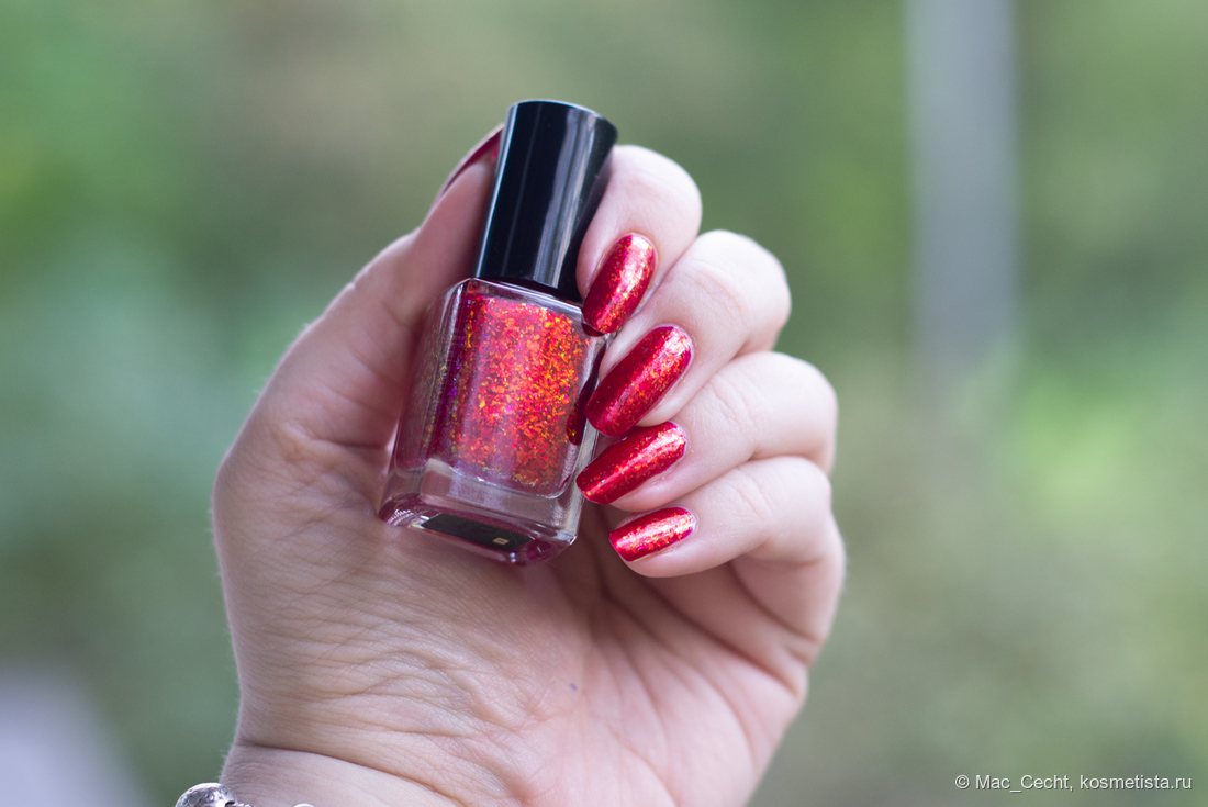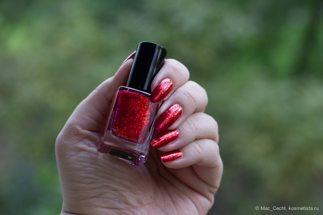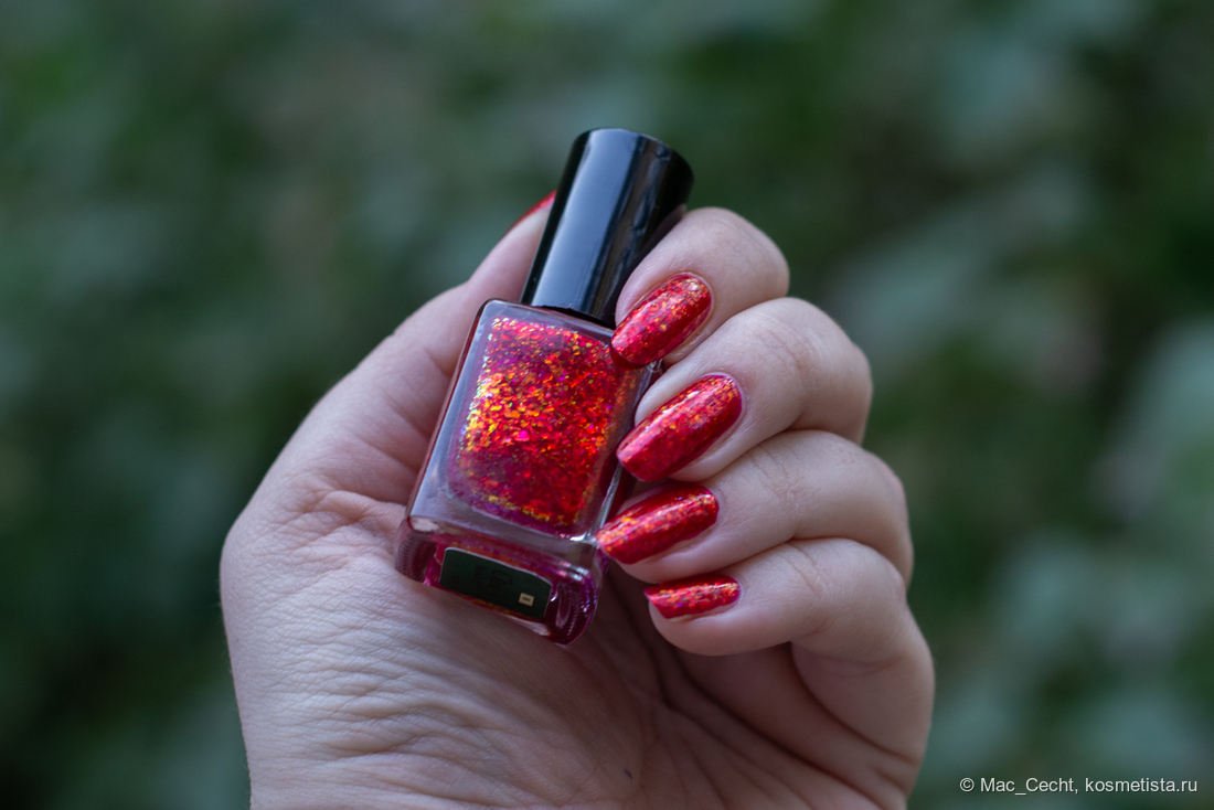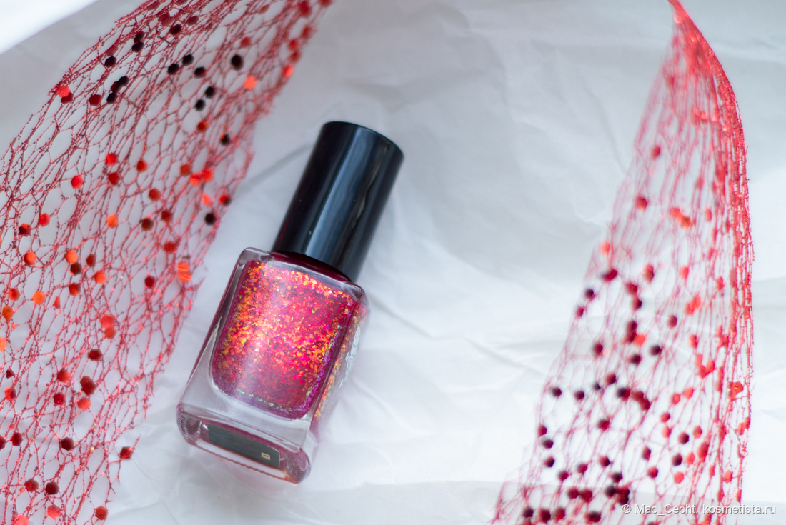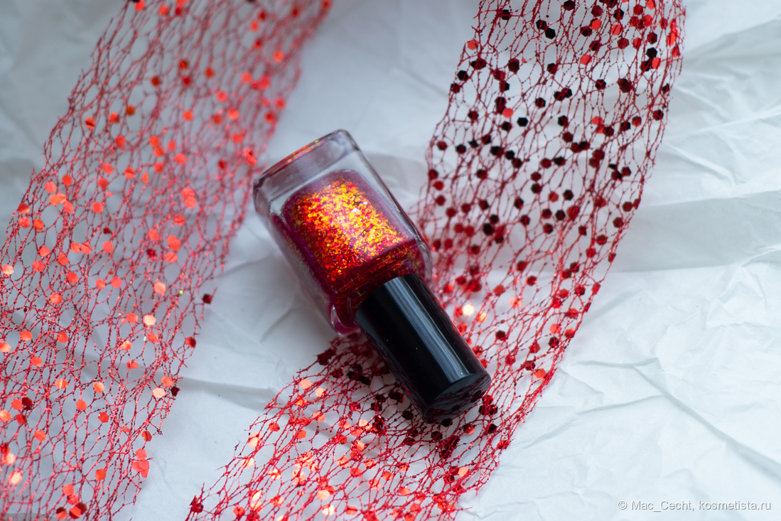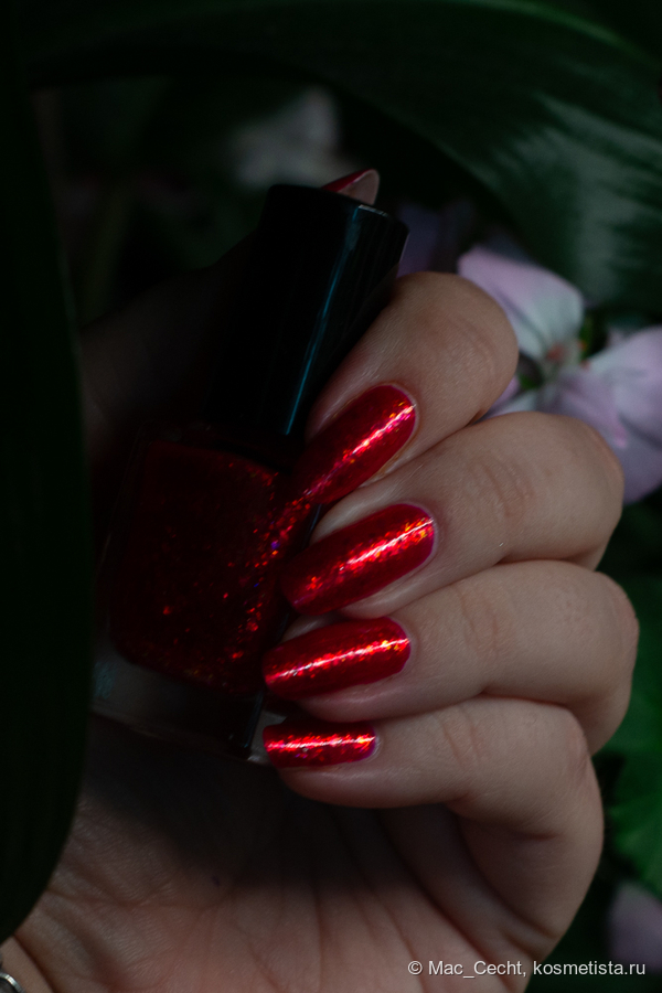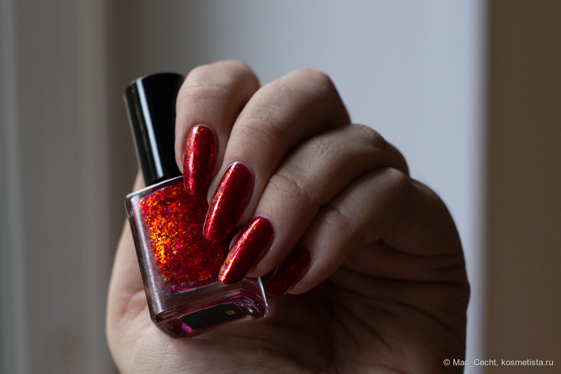 Chili Powder — это холодный красный лак с красной переливающейся слюдой. Лак действительно очень холодный, теплить точно не будет, он прямо с малиновой ноткой. Слюда в нем красная, металлизированная, мягкая. Довольно мелкая по моим меркам, а для Masura, например, стандартная.