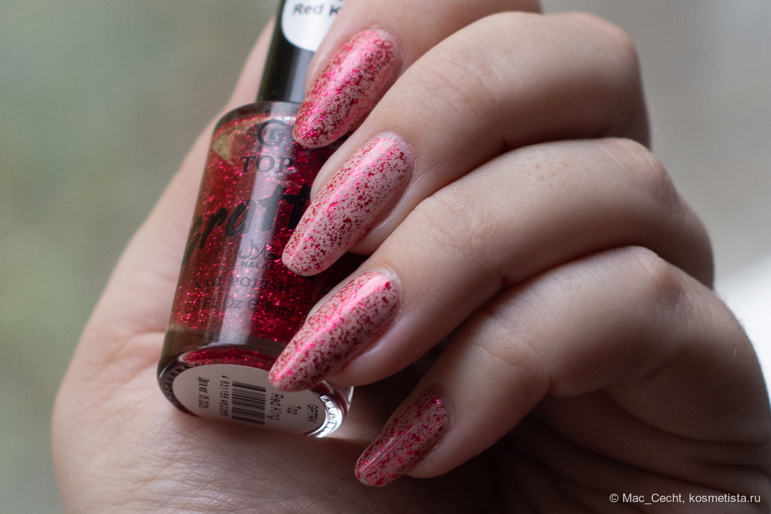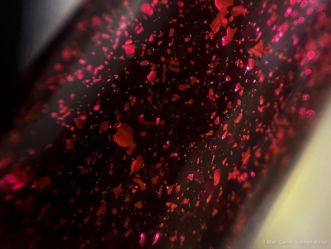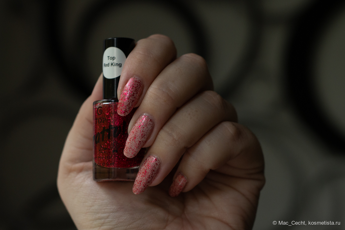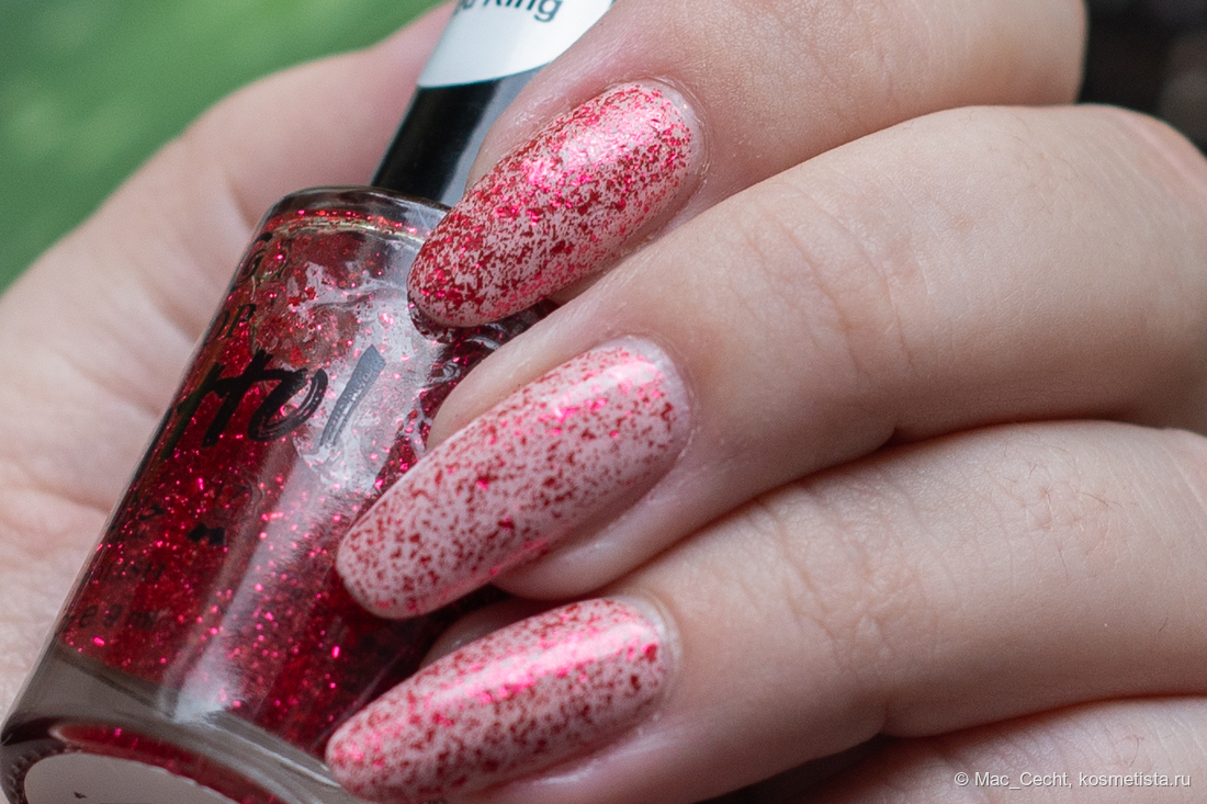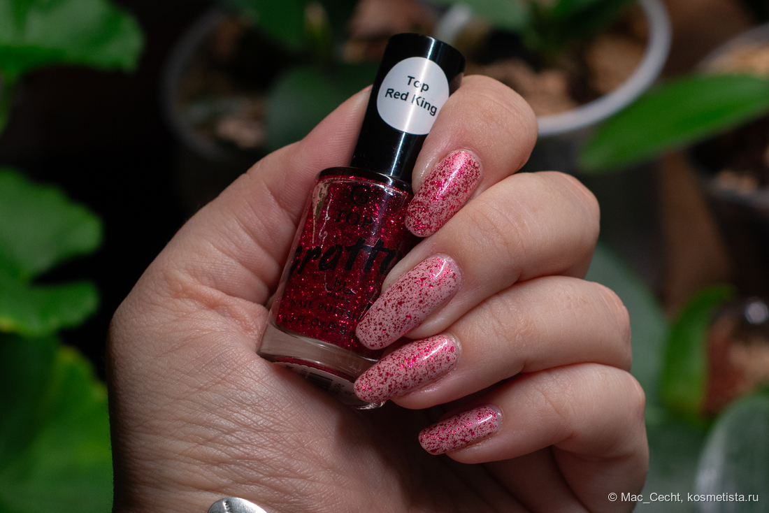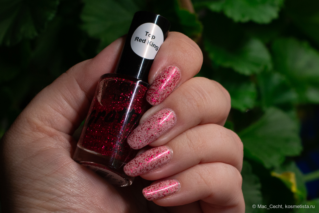 Red King — это чисто красная слюда, бликующая розовым отдельными бликами. То есть у вас не будет розового отлива и перелива на наивыйшей точке ногтя, например, именно отдельные искры.