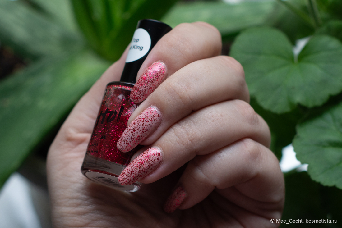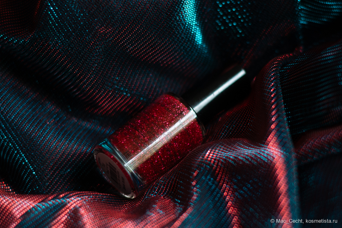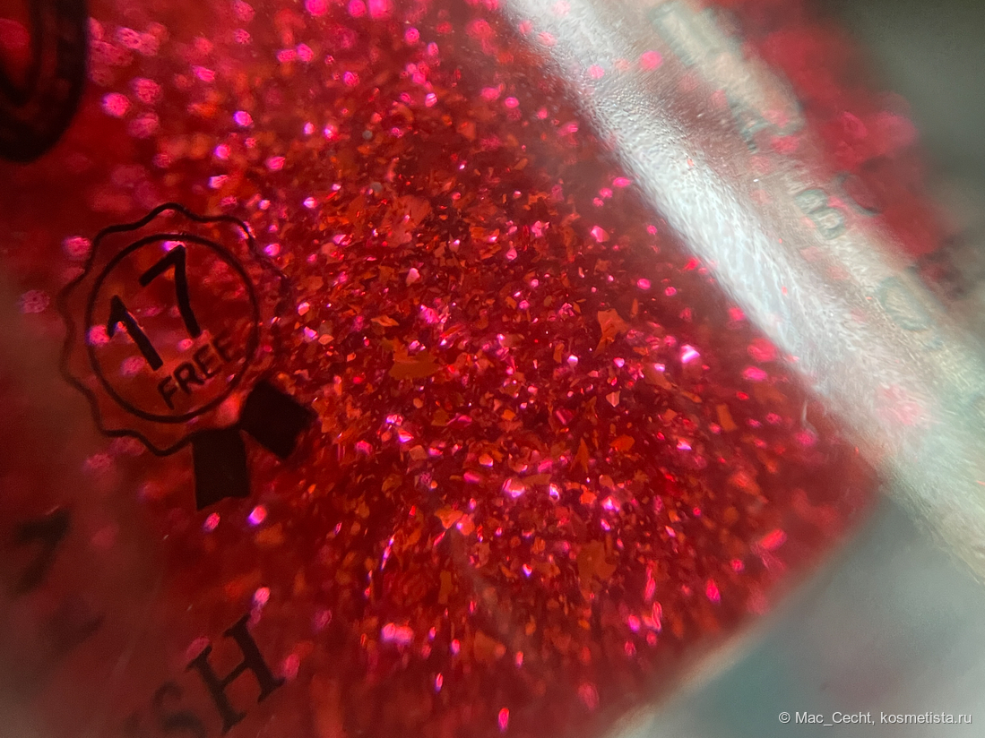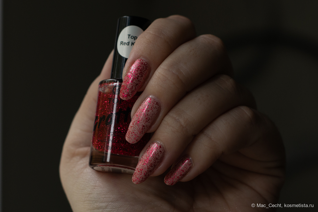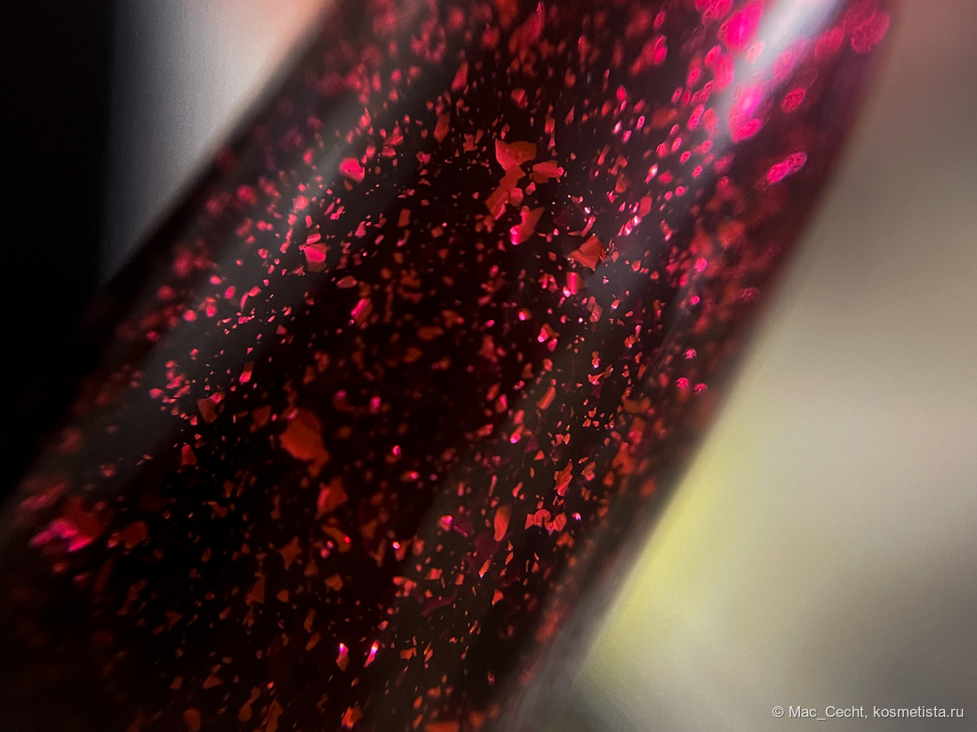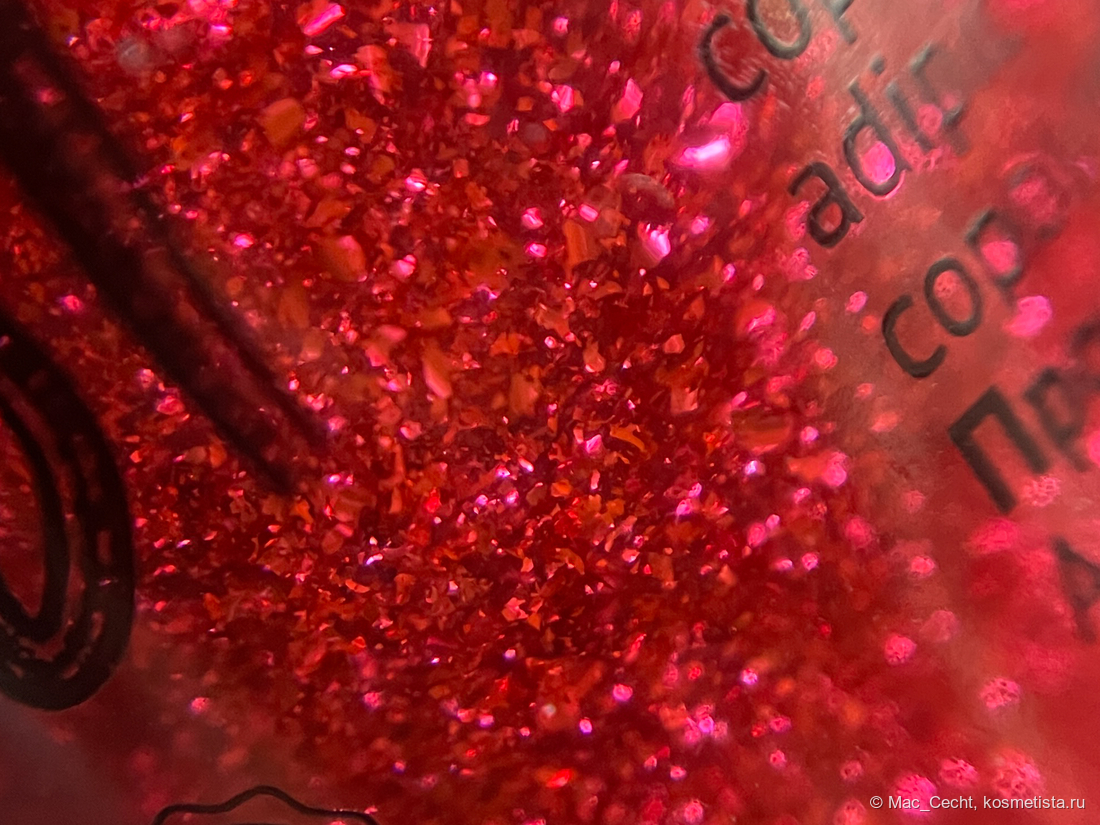 Red King — это чисто красная слюда, бликующая розовым отдельными бликами. То есть у вас не будет розового отлива и перелива на наивыйшей точке ногтя, например, именно отдельные искры.