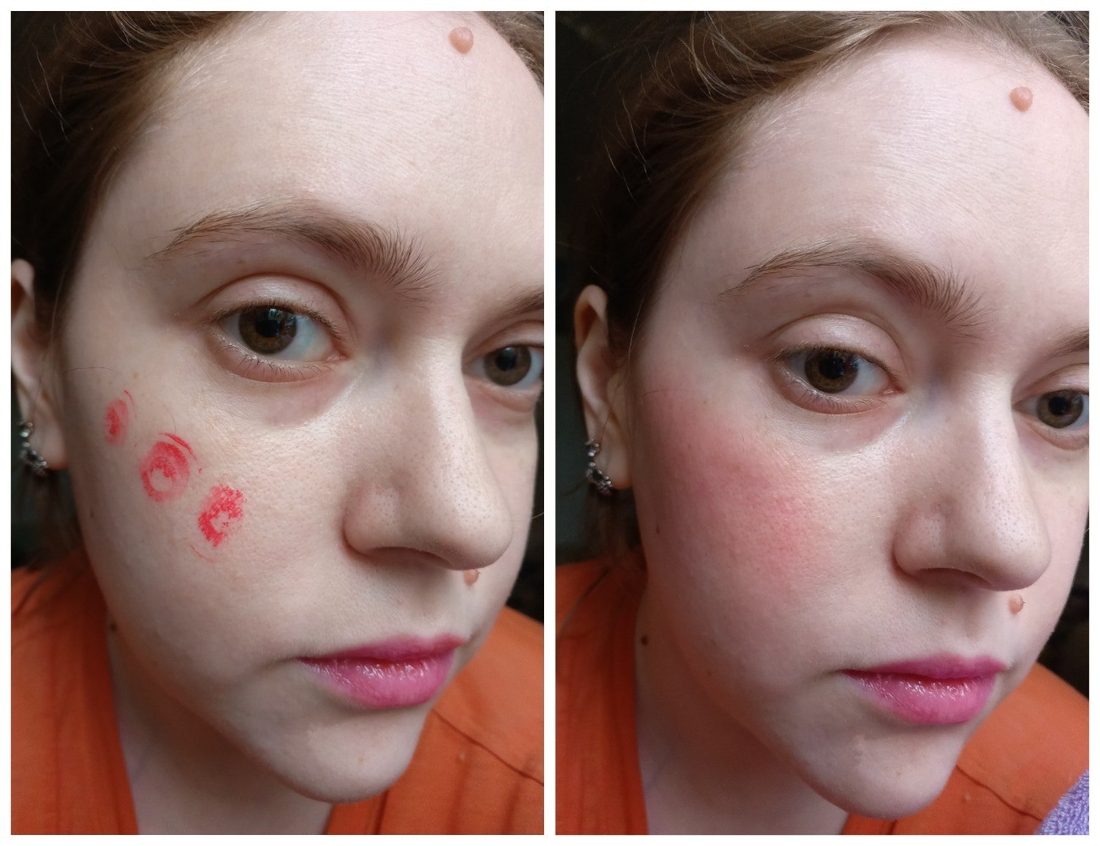 Я наношу эти румяна также, как и любые другие румяна в стике. Ставлю три точки на щеке (на коллаже ниже слева), потом растушевываю пальцами (на коллаже ниже справа). И изначально мне показалось, что все хорошо. Но! Этот оттенок оказался более насыщенным, чем фуксийный. Он ярче, а в сочетании с моей кожей стал болезеннно желтоватым, совсем не здоровым. Вот уж точно не на такой эффект я рассчитывала.