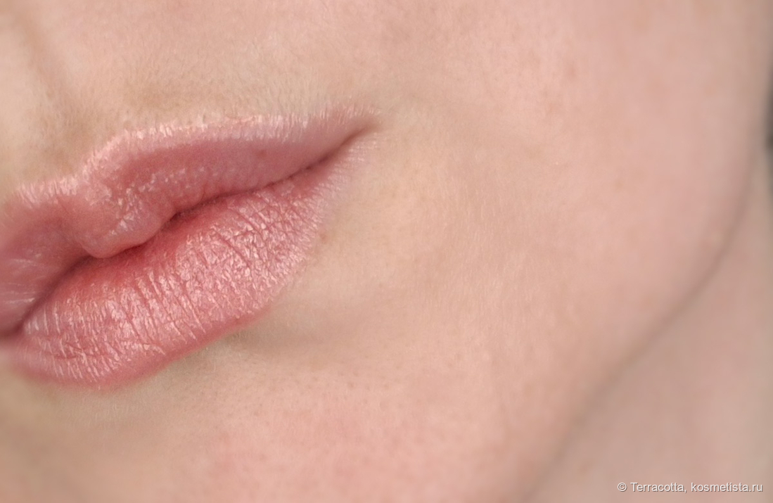 На губах это выглядит очень в стиле 2000-х. Перламутра очень много, по сути, он гораздо заметнее, чем сам оттенок помады.