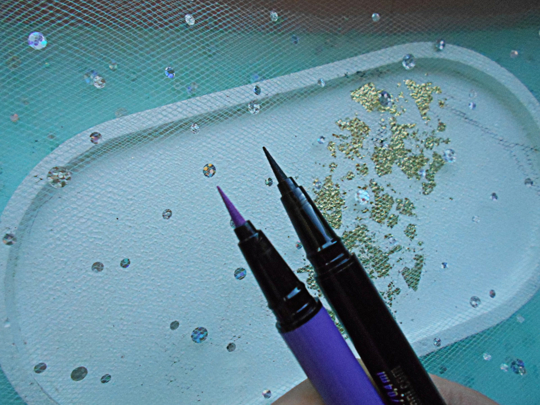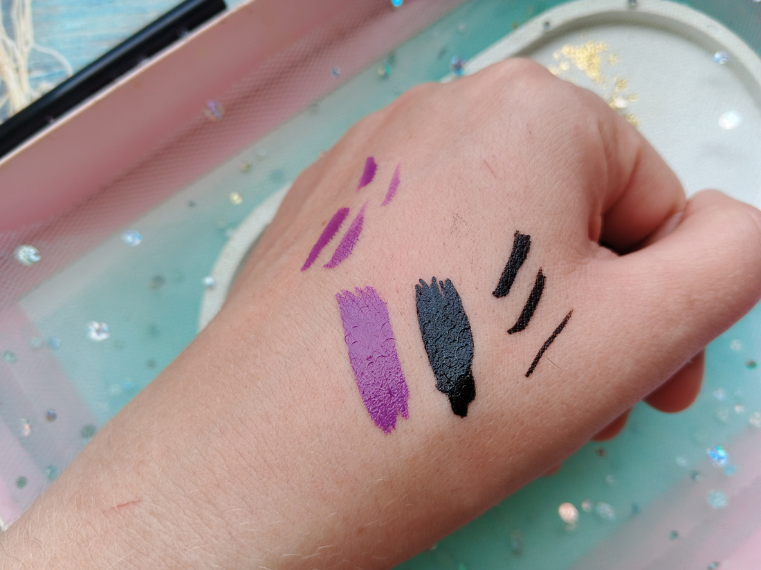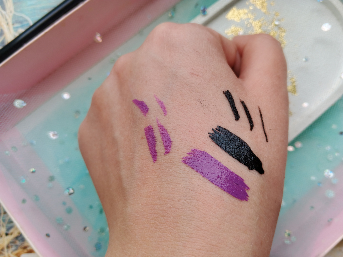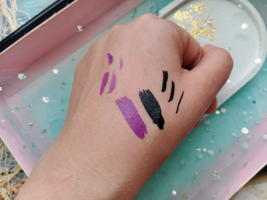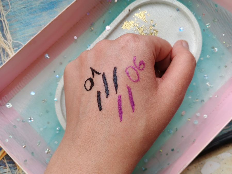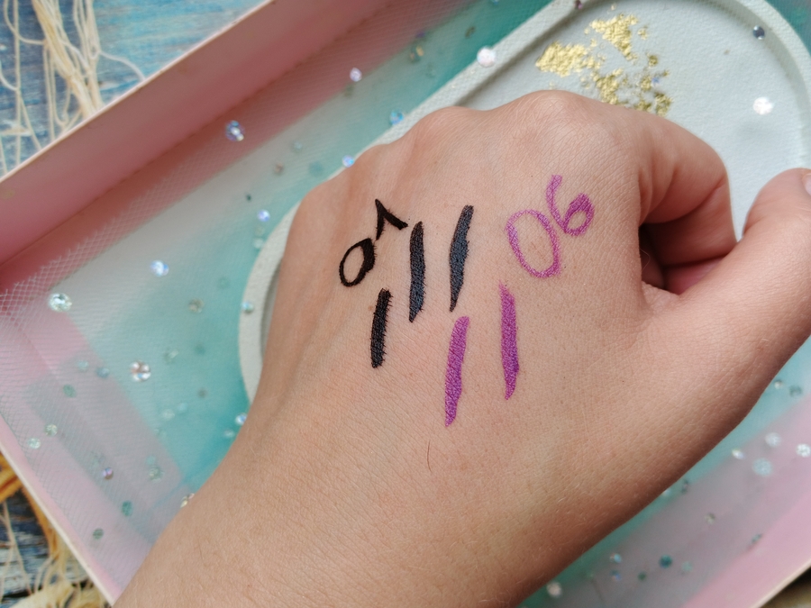 Подводка выпускается в 6 оттенках. Я выбрала чёрный под номером 01 и фиолетовый под номером 06. Оба оттенка яркие и красивые, с хорошей пигментацией.