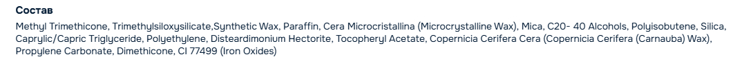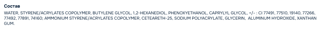 По текстуре достаточно мягкий, содержит микроскопический шиммер. Хорошо наслаивается, ложится без проплешин и комочков. Быстро фиксируется. Имеет сатиновый финиш.