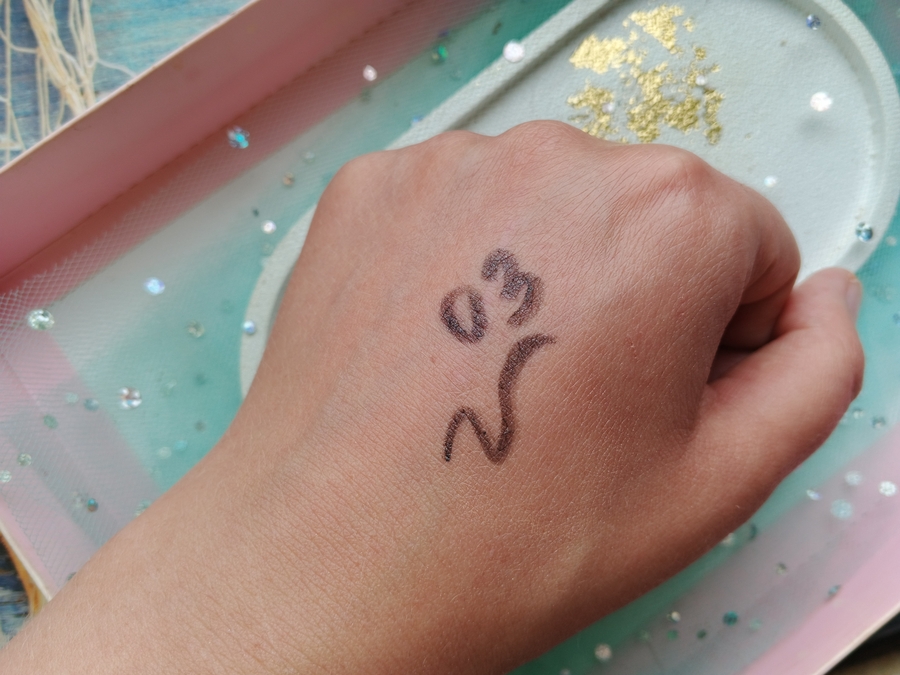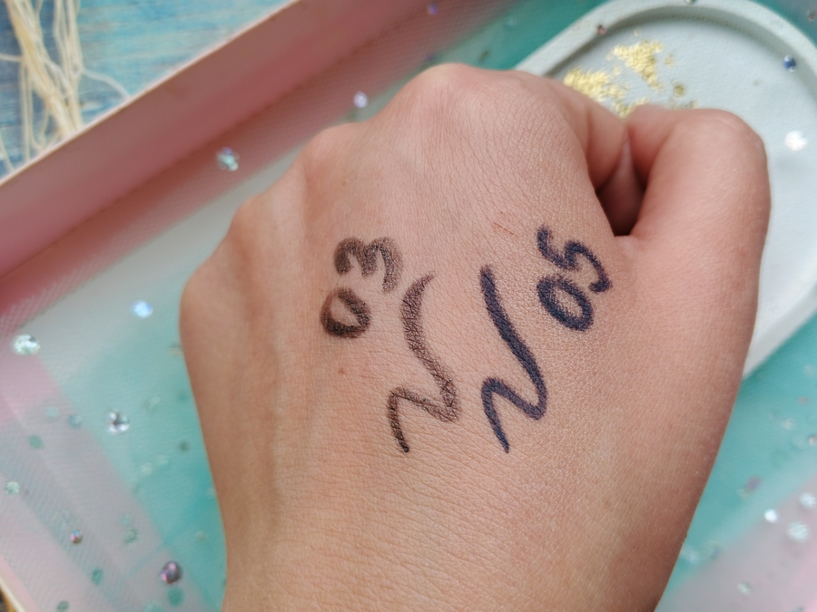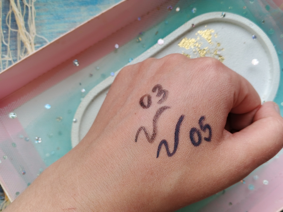 Мне понравились оба оттенка, но 03 — чуть больше. Он создаёт красивый дымчатый эффект. На глазах смотрится не как коричневый, а как блестящий тёмно-серый.