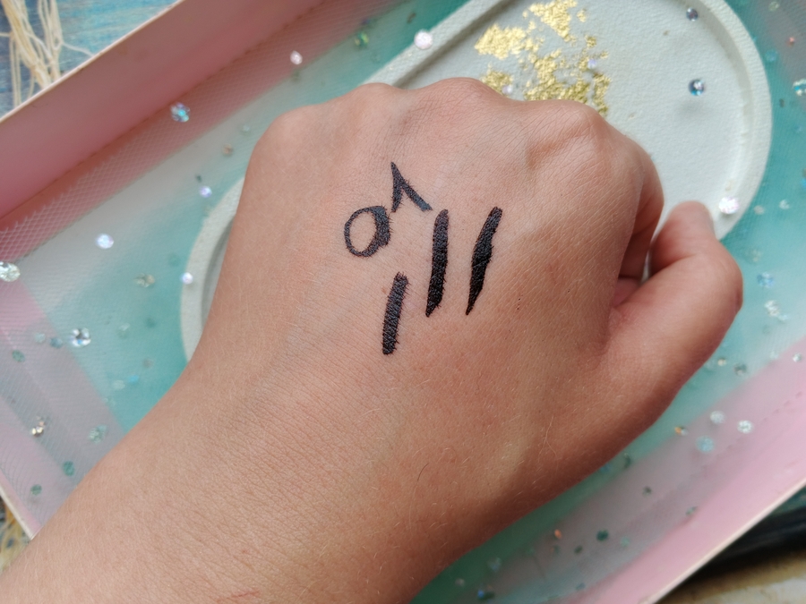 Линия не плывёт, быстро фиксируется. Подводка действительно водостойкая, под струёй воды не смывается.