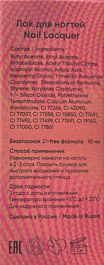 Формула у лака 21-free, а это значит, что лак не содержит вредных ингредиентов такие как Формальдегид, Толуол, Дибутилфталат, Ксилол, Камфора и прочее. Что уменьшает риск аллергии и раздражений, обеспечивает отсутствие токсичных испарений при нанесении и делает безопаснее для беременных и просто чувствительных людей. Да и вообще экологичней.