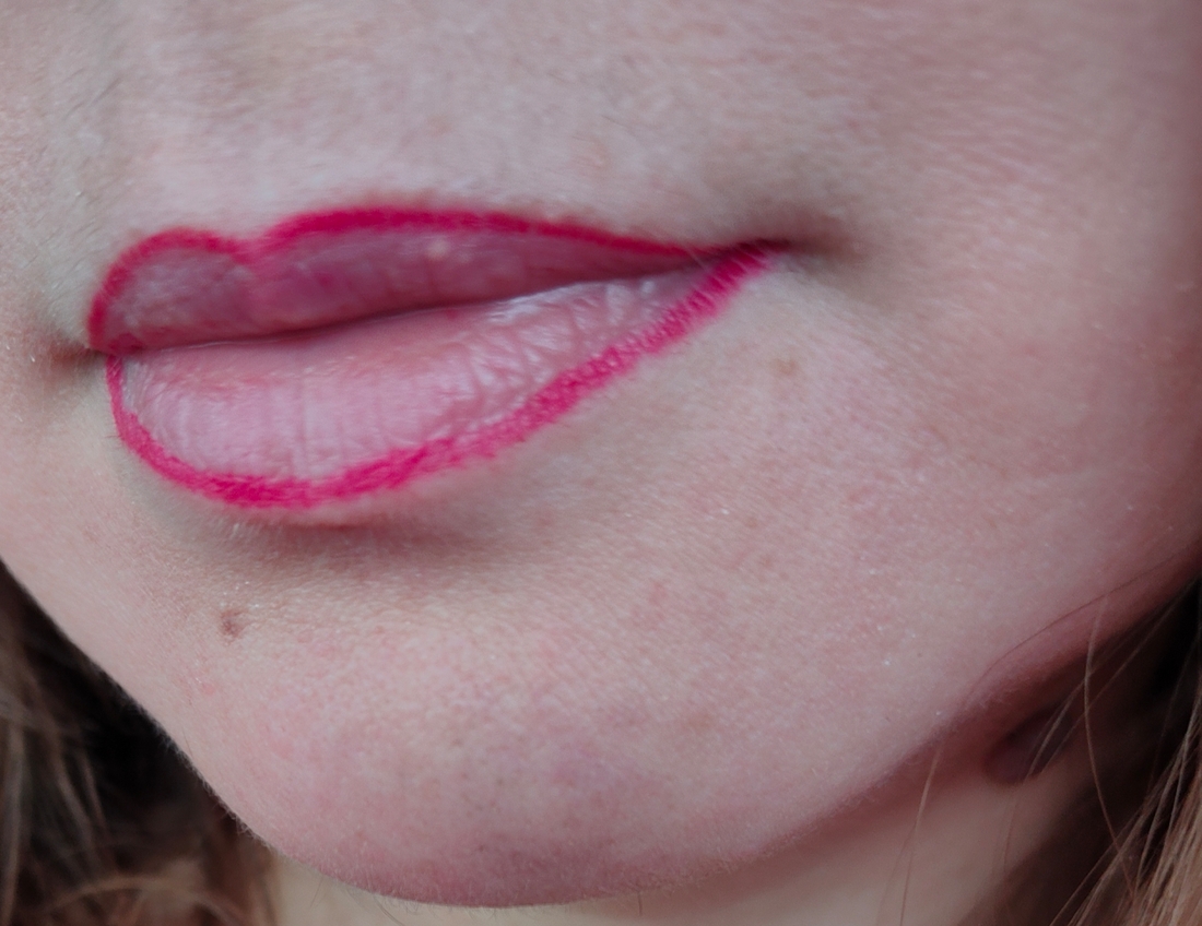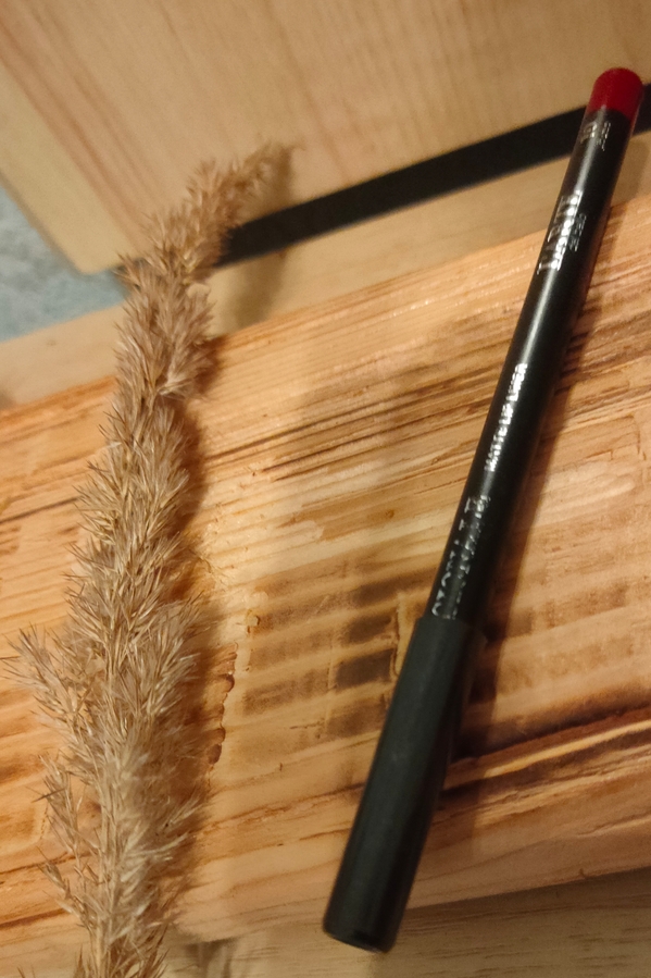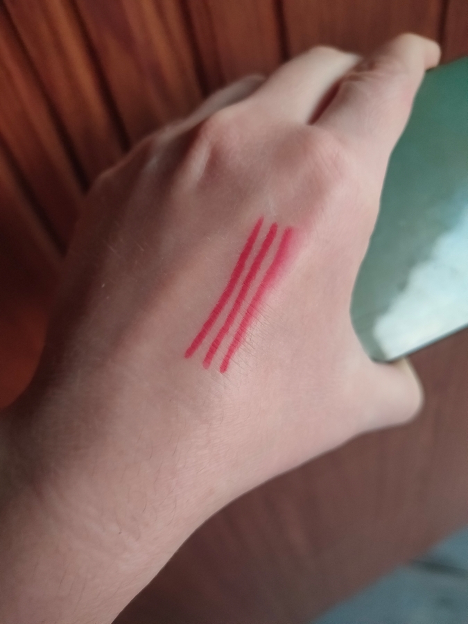 При дневном на улице. Видно, что красный уходит в розовый. Это надо учитывать, потому как буквально сегодня нанесла с красной помадой, а на фото обнаружила, что помада красная а карандаш блин, розовый какой то…