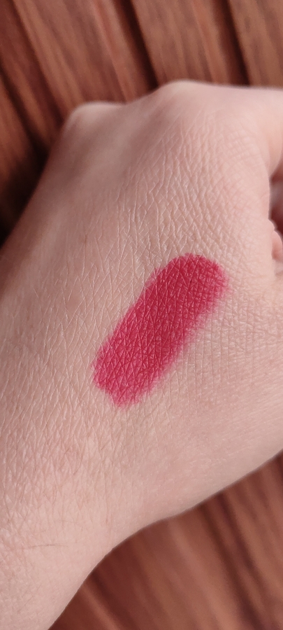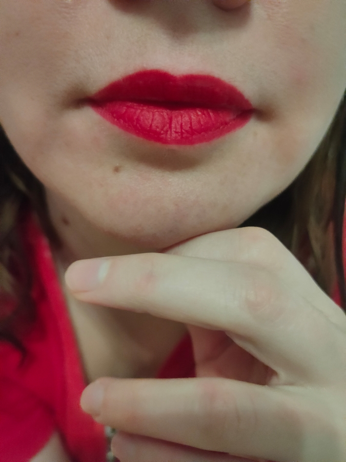 Заявлен как матовый, но нет, при использовании в качестве помады, финиш не наглухо матовый. Интересно, что особо сухости никакой не бывает, когда он на губах.