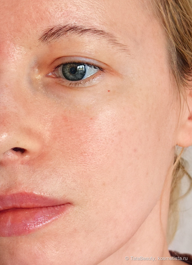 Покрытие — от среднего до плотного. Я такое покрытие иногда люблю, когда, например, хочу «намакияжется» и сделать выразительный макияж глаз или яркие губы. У меня нормальная кожа, возрастная, есть расширенные поры на щеках и неровный тон. На фото кожа более красная, чем обычно, так как вечером использовала кислотный тоник.