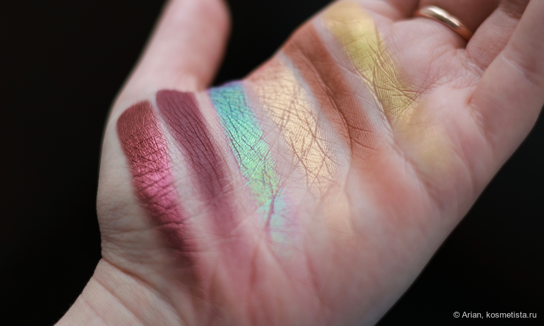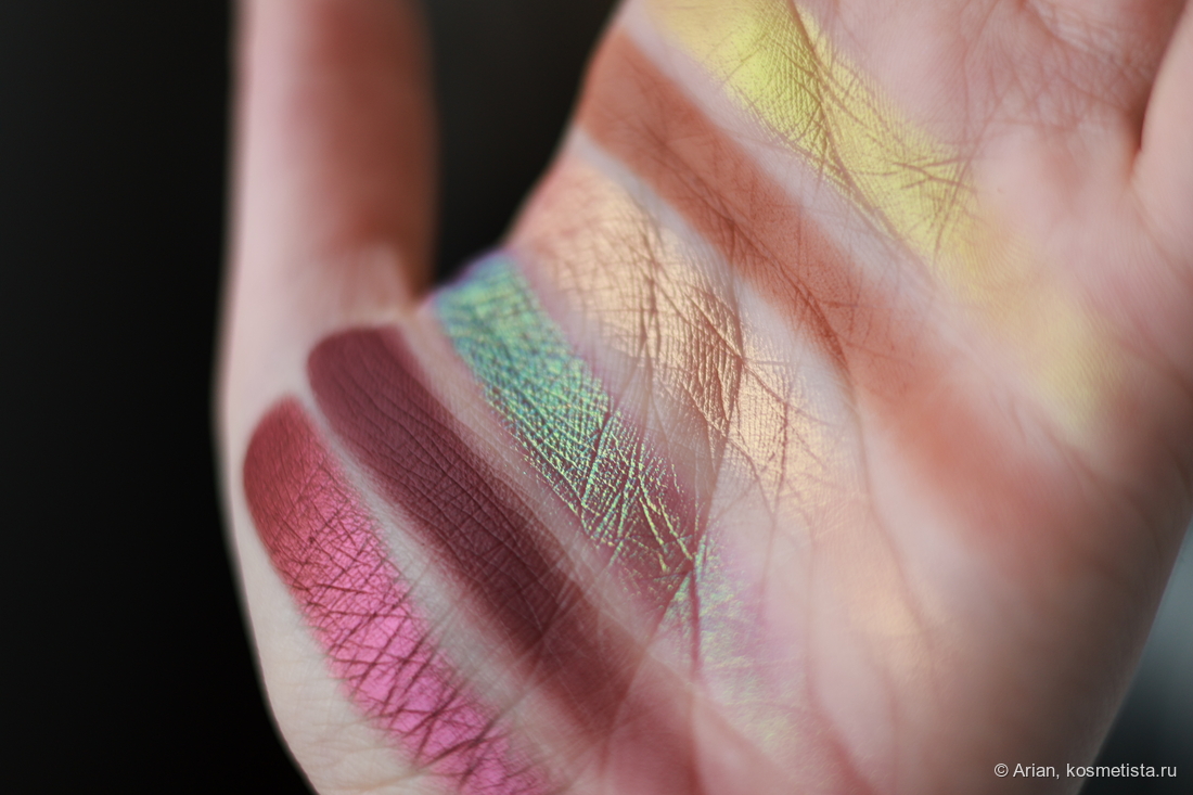 Очень необычная палитра: наполовину холодная, наполовину тёплая. Довольно специфическая, с характером. Не офисная, хотя с ней можно сделать пару вариантов макияжа для скромниц.