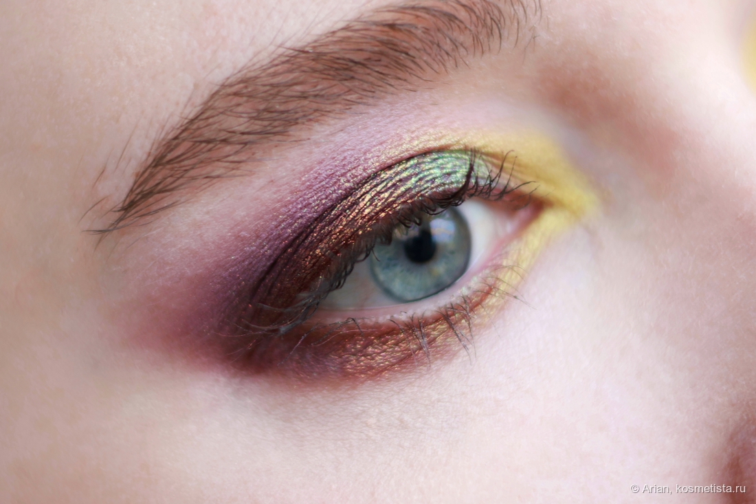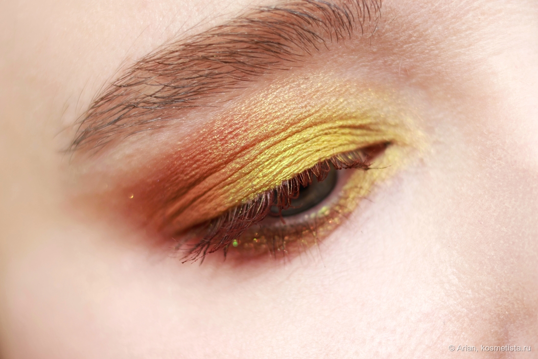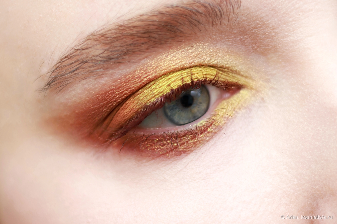 - 149 — профиль «Хвастунья» — лимонный полупрозрачный сатин. Довольно твёрдый, но переносится на кожу хорошо и кистью, и пальцем. На моих веках почти сразу окисляется до грязно-жёлтого, так что лучше наслаивать, иначе вид… на редкого гурмана.
