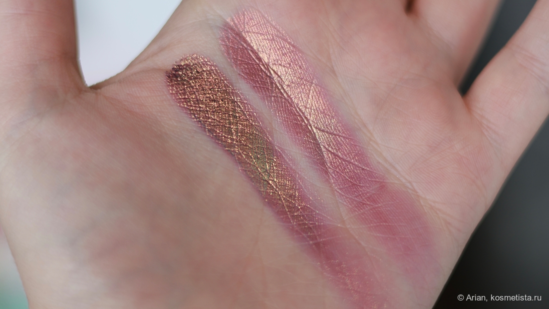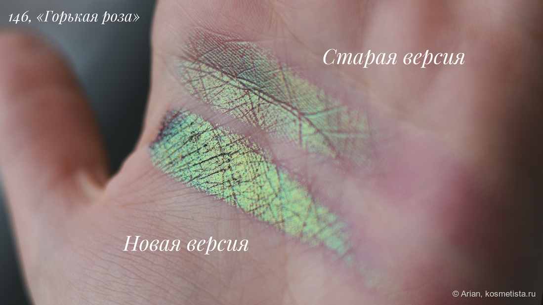 Теперь покажу сравнение самого интересного оттенка палетки — 146 — в старой и новой формулах. Основная разница в том, что новый вариант мягче, а его частички крупнее. Теперь у оттенка выраженные искры и переливы читаются чётче даже без влажного нанесения. Предыдущая «Роза», иронично, была слишком розовой для меня из-за его базы и общего эффекта больных глаз. В новом варианте база поменялась не так сильно, однако результат уже не плачевный.