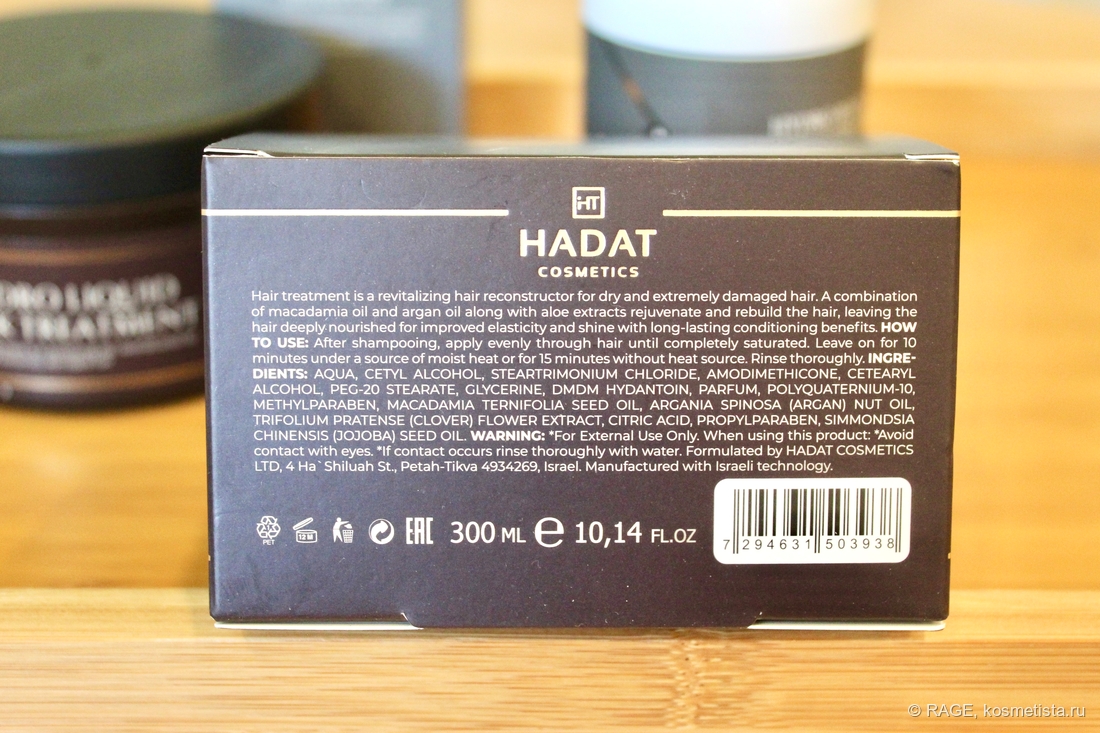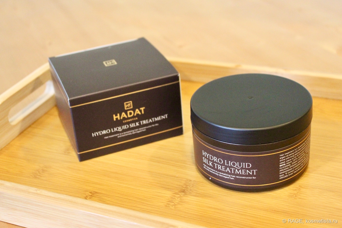 Первый опыт знакомства с Hadat был неудачным: я попробовала набор миниатюр, и ни шампунь, ни кондиционер меня не впечатлили. Но всеобщий ажиотаж сделал своё дело, и я заказала себе их знаменитую маску Hydro Liquid Silk Treatment, а укрепляющий шампунь против выпадения волос мне достался в подарок.