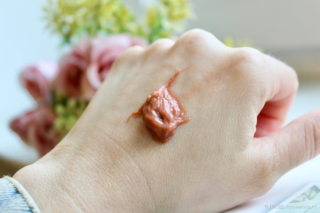 Текстура кремовая, густая, очень любопытного терракотового цвета: