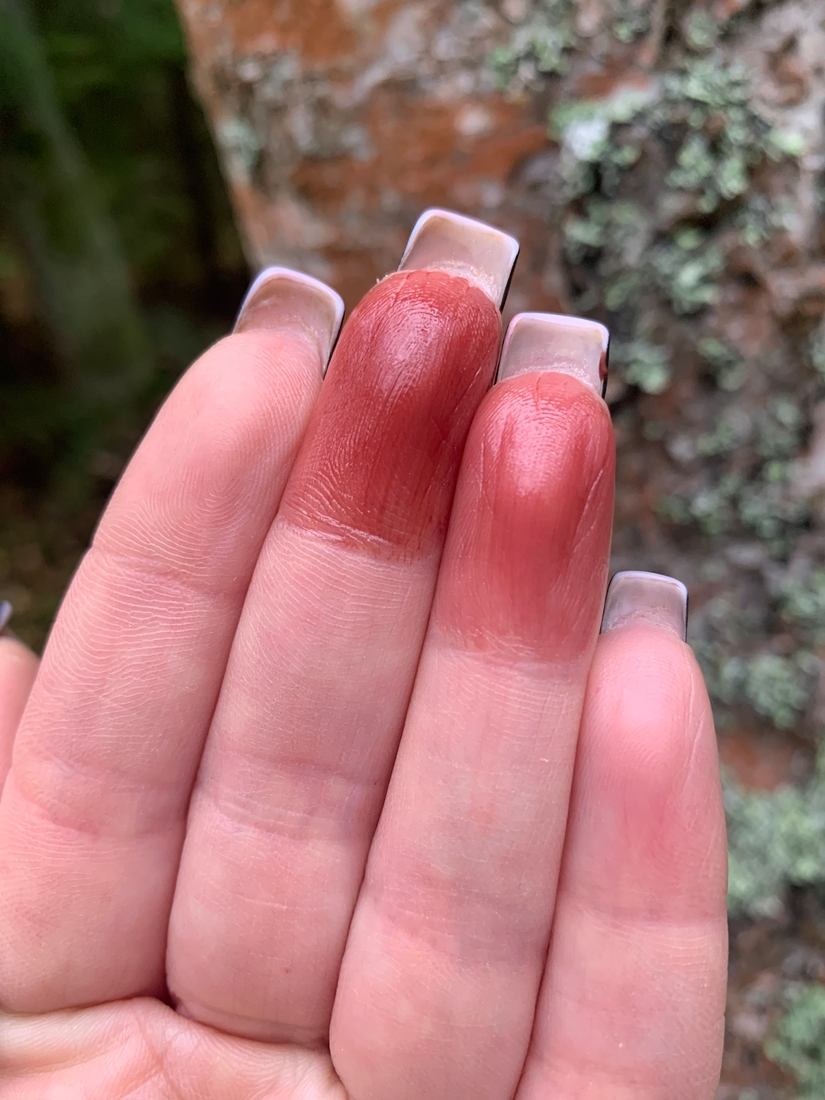 На каждом фото на безымянном пальце нанесение в один слой, на среднем — 2-3 слоя.