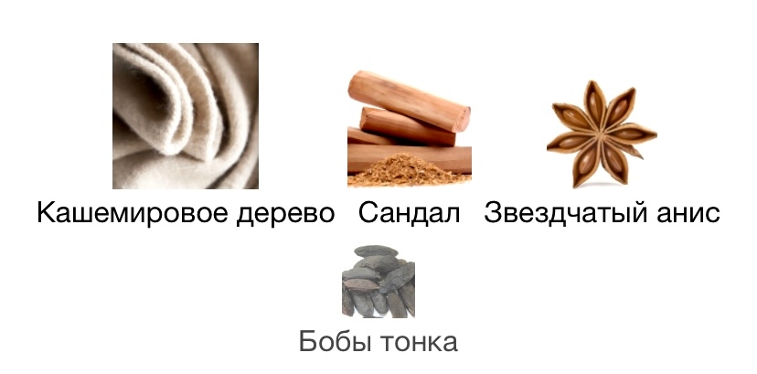 древесный, анисовый, мягкий, пряный, пудровый, бальзамический, мускусный, тёплый, пряный.