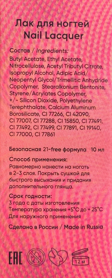 У всех лаков этой коллекции формула 21-free, то есть не содержит ничего из списка потенциально небезопасных ингредиентов, такие как толуол, формальдегид и прочее.