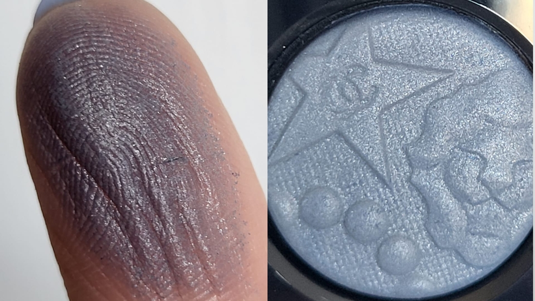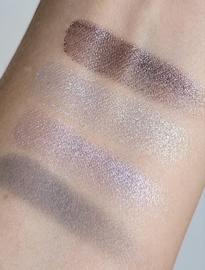 4.Серый сатин. Ну, это не совсем привычный серый. Скорее серо-голубой, а на коже даже иногда свинцовый, подозреваю, что этот оттенок будет на всех выглядеть по-разному в зависимости от вашего цвета кожи. В свотче на пальце видны мелкие вкрапления спаркла, но на веке их нет. Больше матово-сатиновый, хорош для растушевки, как основа под все остальные оттенки.