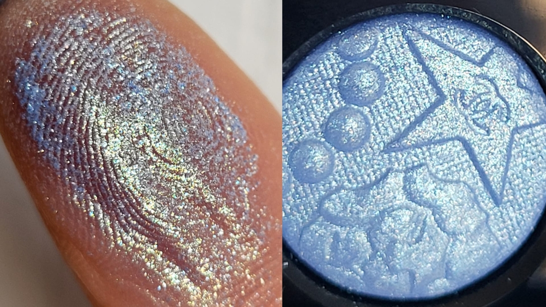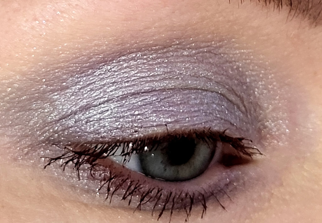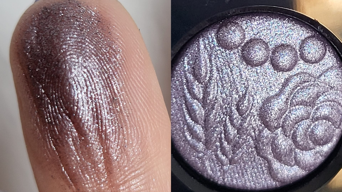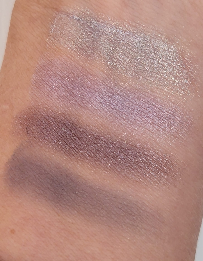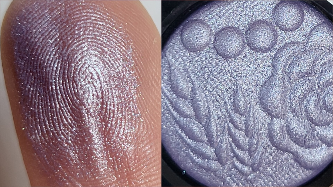 Самый рыхлый в палетке, пылит при наборе, но не активно. Очень блестящий, полупрозрачный, но можно добиться яркого цвета. Хорошо набирается плоской плотно набитой кистью, спонжем или пальцем. Осыпаний нет или они очень незначительны.