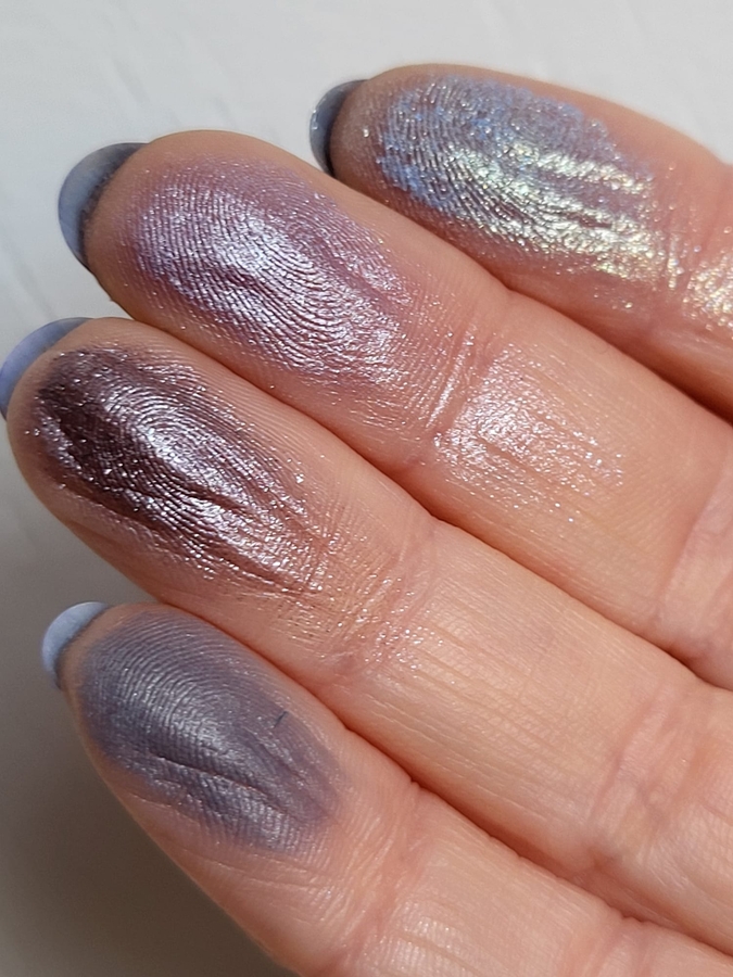 2.Сиреневый. Классический сиреневый, иногда при определенном освещении (покажу ниже в свотчах) чуть выдает голубой, а в тени чуть сереет. Мне кажется такой эффект дают серебристые вкрапления, однако оттенок не является дуохромом.