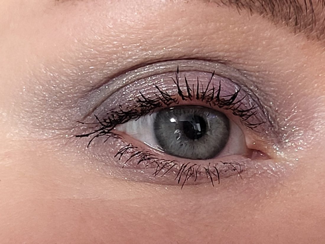 1.Серый (4) в наружный угол верхнего века и по складке, затем по нижнему веку, затем тауп (3) поверх серого на наружный край верхнего века, по центру сиреневый (2), а в угол глаза и внутренний край нижнего века точечно голубой (1).