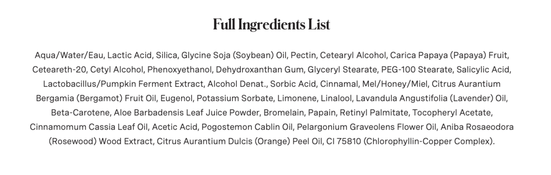 Молочная кислота на втором месте состава (салициловая тоже в первой части), но нигде не указана концентрация и pH средства. Вы не найдёте такой информации на упаковке и даже на официальном сайте бренда.