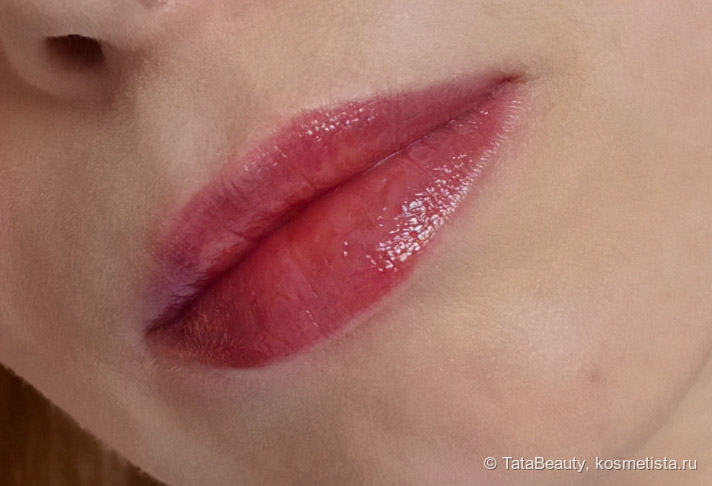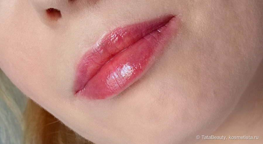 По текстуре, как бы удивительно это не звучало, но это масло. Густота оптимальная, это не водичка и не гель. Наносится на губы без проблем. Сразу даёт заметный зеркальный глянец. А вот цвета тут нет, масло прозрачное. Со временем после нанесения оно впитывается в кожу губ и глянец постепенно уходит. После перекуса или чашки кофе сойдёт быстрее. Обед не выдержит. Стойкости у масла нет, но это, в принципе, свойственно маслам для губ.