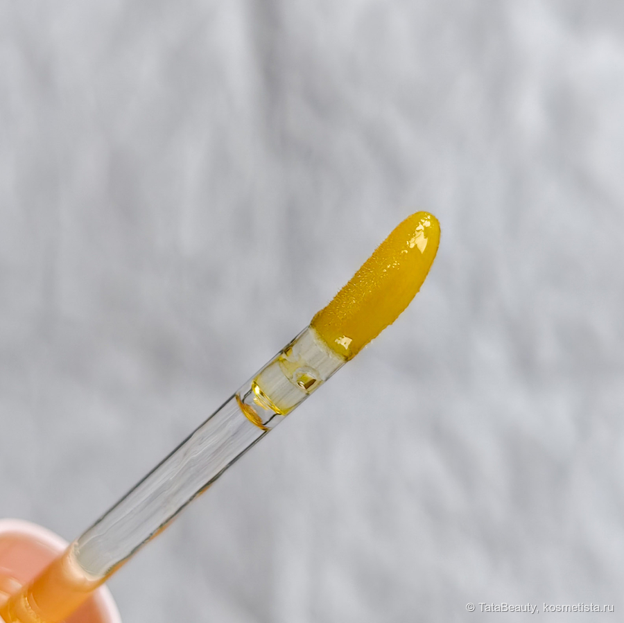 Оформление милейшей! Аккуратный флакон необычной изогнутой формы выполнен из стекла, поэтому он приятно тяжёленький. Флакон прозрачный, поэтому мы видим масло, которое имеет красивый медовый оттенок. Есть также дополнительная картонная коробка. У масла очень насыщенный сладкий медовый аромат, он прям приторный и настолько сильный, что несколько минут после нанесения в ощущаю его от губ.