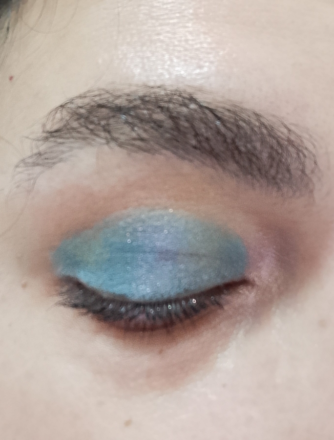 Нанесла плоской кистью на кремовую базу. Очень похож на «Хозяйку затонувшего корабля». В баночке, кстати, тоже, только блёстки немного отличаются.