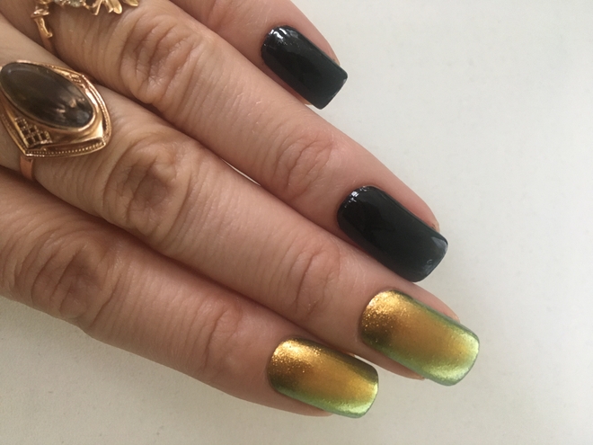 Лак состоит из мелкого дуохромного шиммера в прозрачной базе. Шиммер переливается из золотого в зеленый. В бутыльке на углах виден еще синий оттенок, на ногтях он не проявляется.