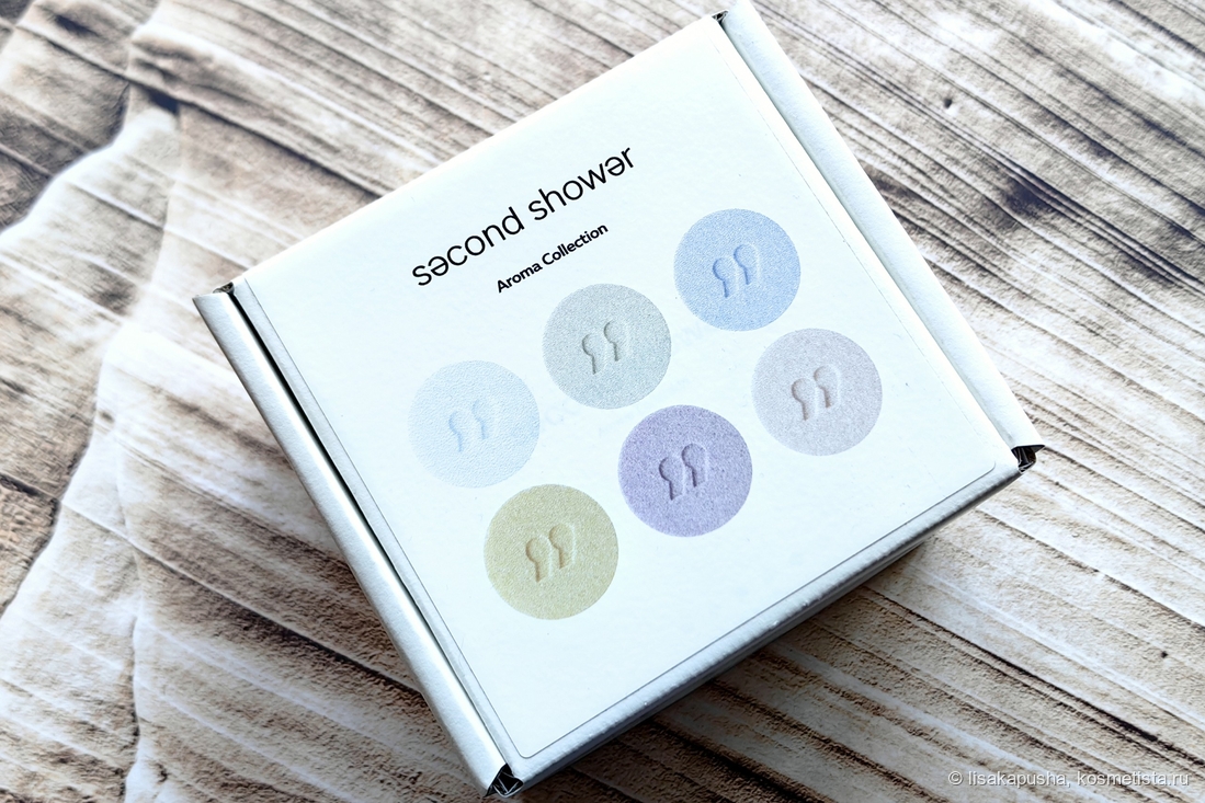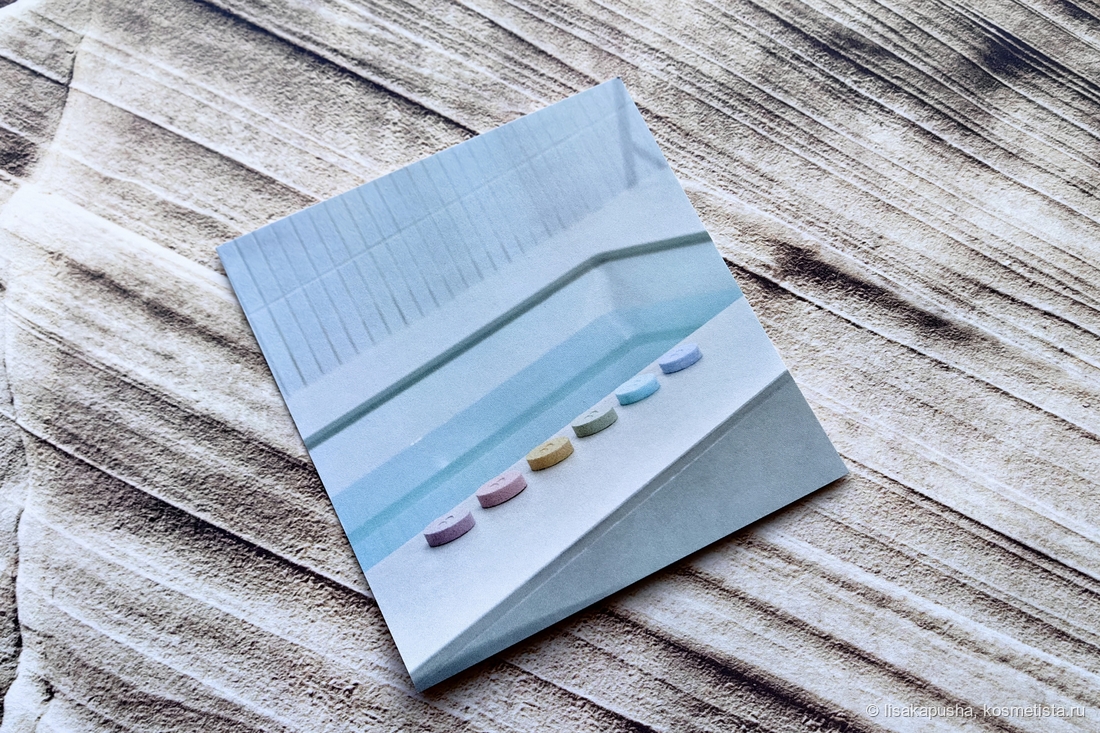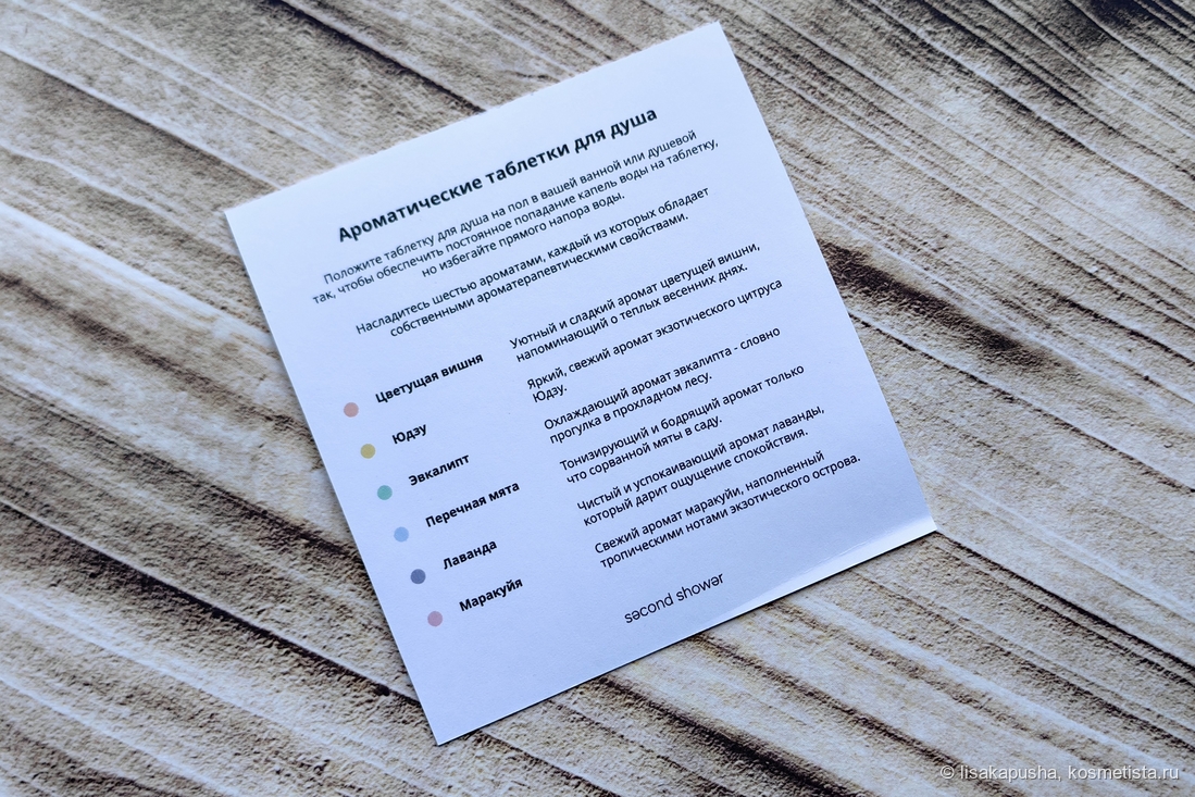 Набор состоит из шести разных таблеток: цветущая вишня; юдзу; эвкалипт; перечная мята; лаванда; маракуйя. Чтобы не гадать, а выбрать определённый аромат, описание которого мне понравилось в приложенной карточке можно ориентироваться по цвету. По описанию их я бы разделила на две категории: утренние (бодрящие и задающие темп на день) и успокаивающие (подготавливающие ко сну и расслабляющие).