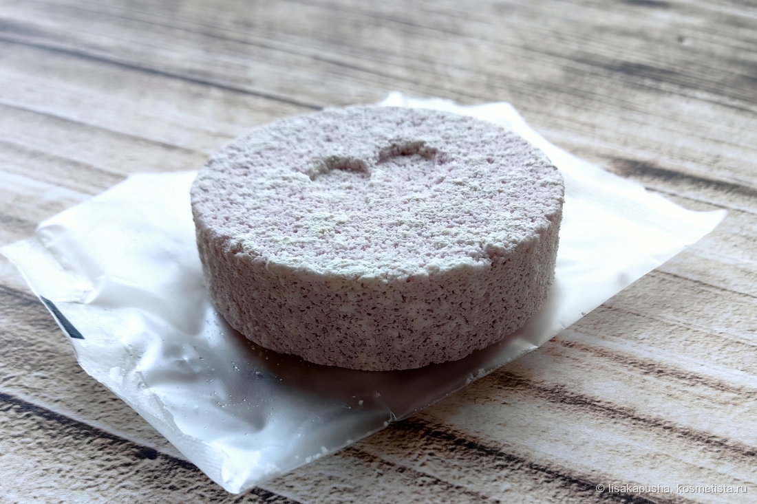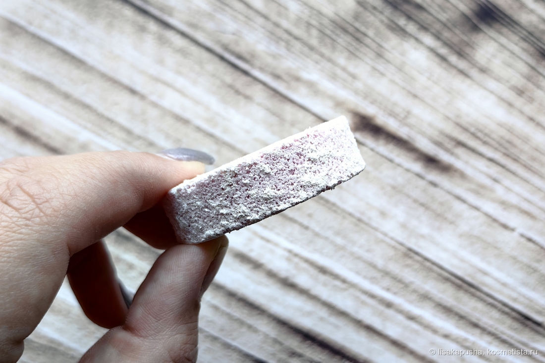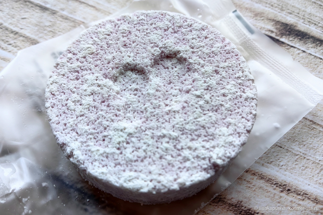 Таблетка при взаимодействии с водой начинает шипеть, растворяться, создавая небольшие пузырьки вокруг себя. Процесс этот медленный, поэтому подойдёт для любителей долгого принятия душа. Она не окрашивает воду в яркий цвет, но создаёт эффект молока.