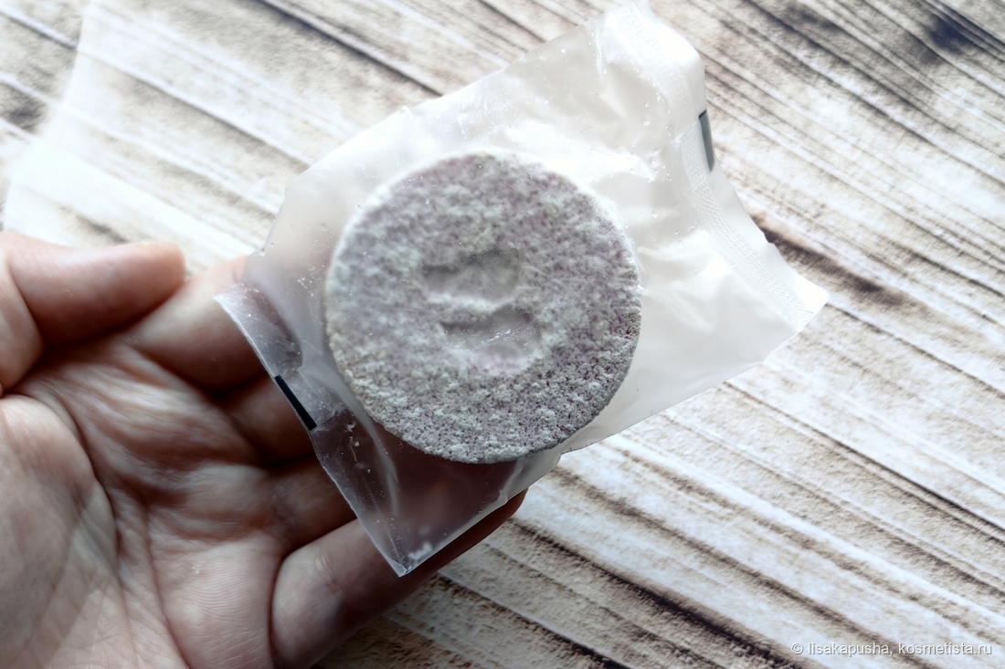 Каждая таблетка находится в отдельном пакетике, что делает её способной к транспортировке в одиночном виде. Для открытия упаковки необходимо потянуть за край, где находится линия надреза. Таблетка представляет собой сплюснутый круг. Текстура продукта, из которого она состоит, не однородная. Но гораздо крупнее, чем у того же бурлящего шара. Аромат лёгкий. Но уловимый.