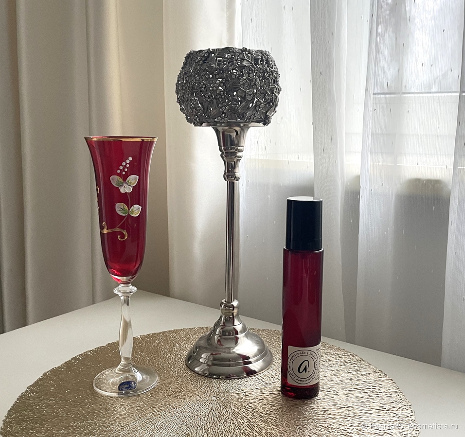 Стеклянный прозрачный флакон насыщенного красного цвета.