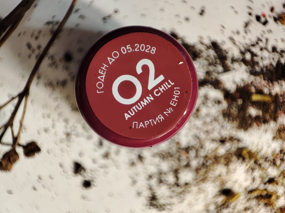 Оттенок невероятный, красно-коричневый нюд. При смене освещения ведёт себя по разному: при дневном свете выдает краснинку брусничного варенья, в помещении становится теплым коричневым, сливаясь с подсохшими опавшими листьями.