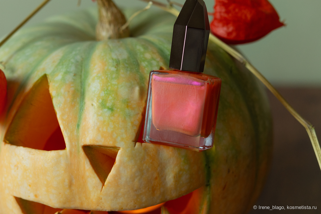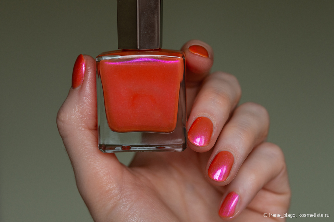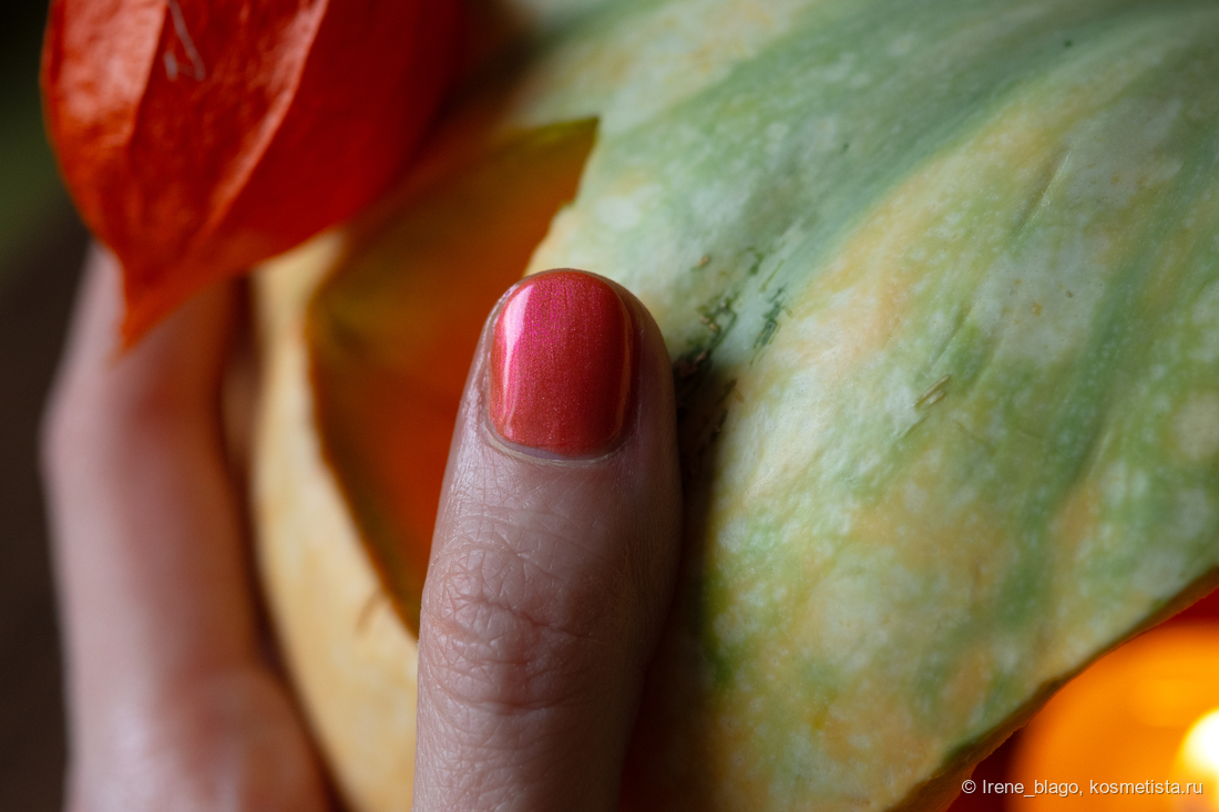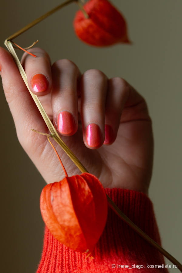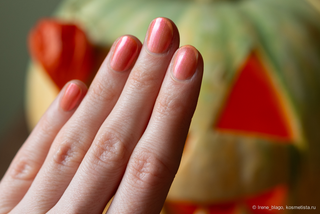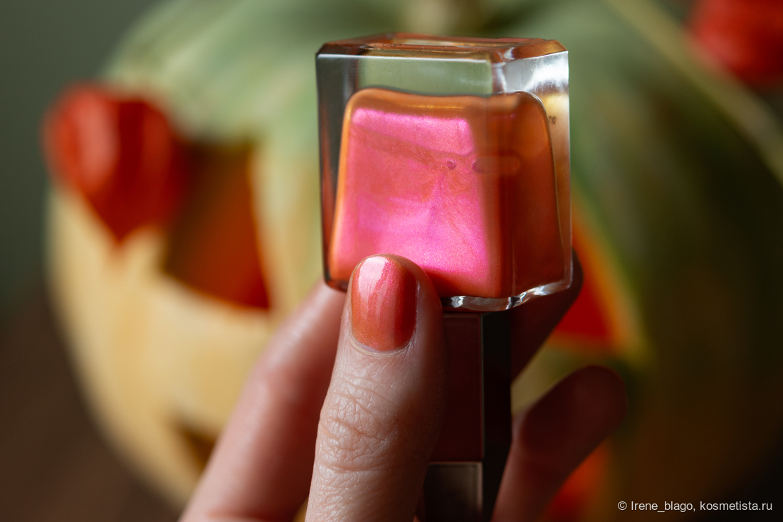 Представляет собой теплый огненно-тыквенный оттенок с розовым шиммером, который дает красивый кораллово-закатный эффект. При этом какой-то сложности, дополнительных переливов и световой игры в этом сочетании уже нет, хотя очень ожидала увидеть более выраженные цветовые переходы. Поэтому оттенок смотрится максимально ровно в различных погодных и световых условиях.